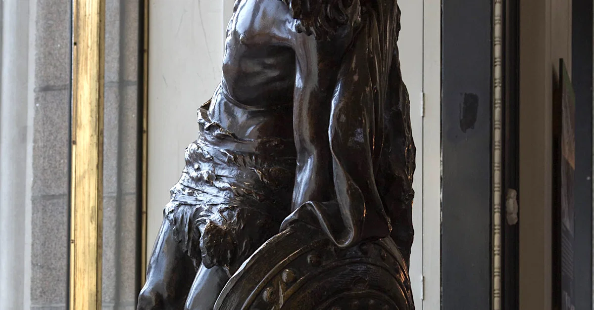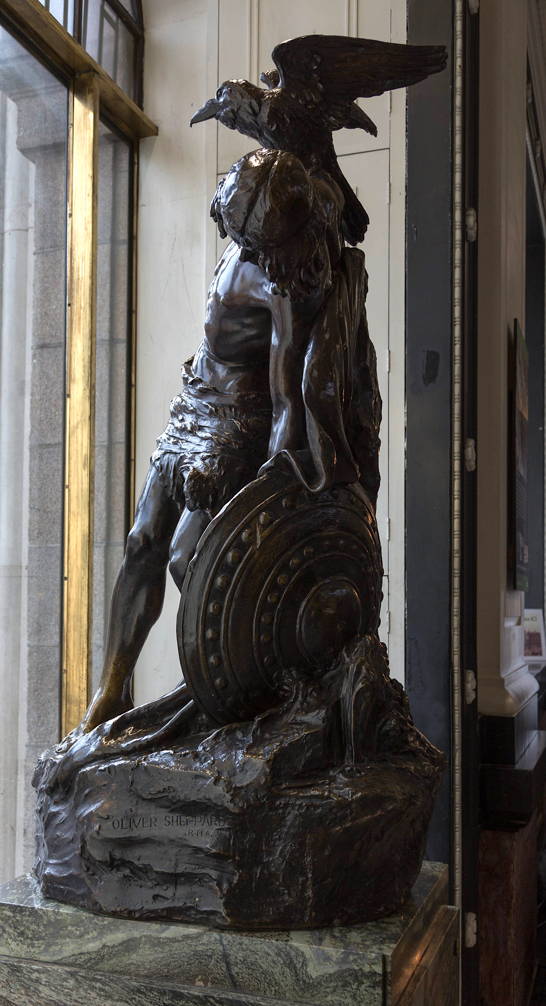 A statue of the Irish-Celtic cultural hero Cú Chulainn, the chief character of the Ulster Cycle. By Oliver Sheppard, 1935 CE. (General Post Office, Dublin)