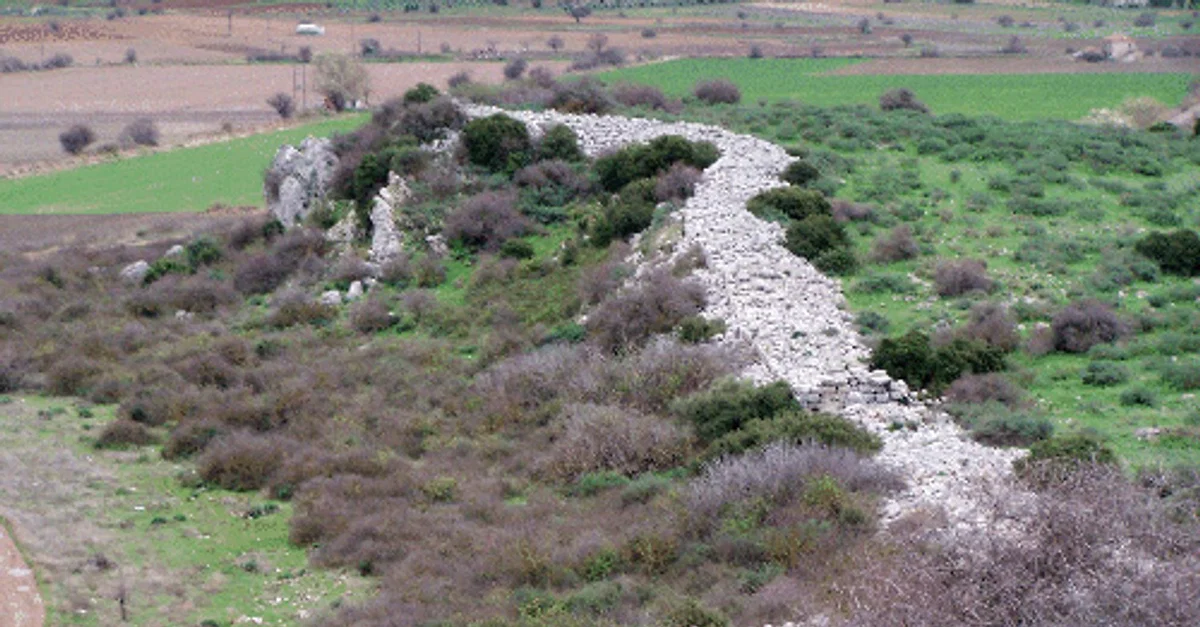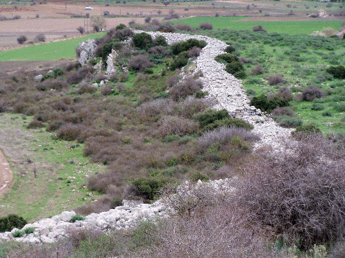 The northwest part of the fortification or circuit wall at Gla, Greece as seen from the Mycenaean palace, built c. 13th century BCE (Mycenaean LHIII).