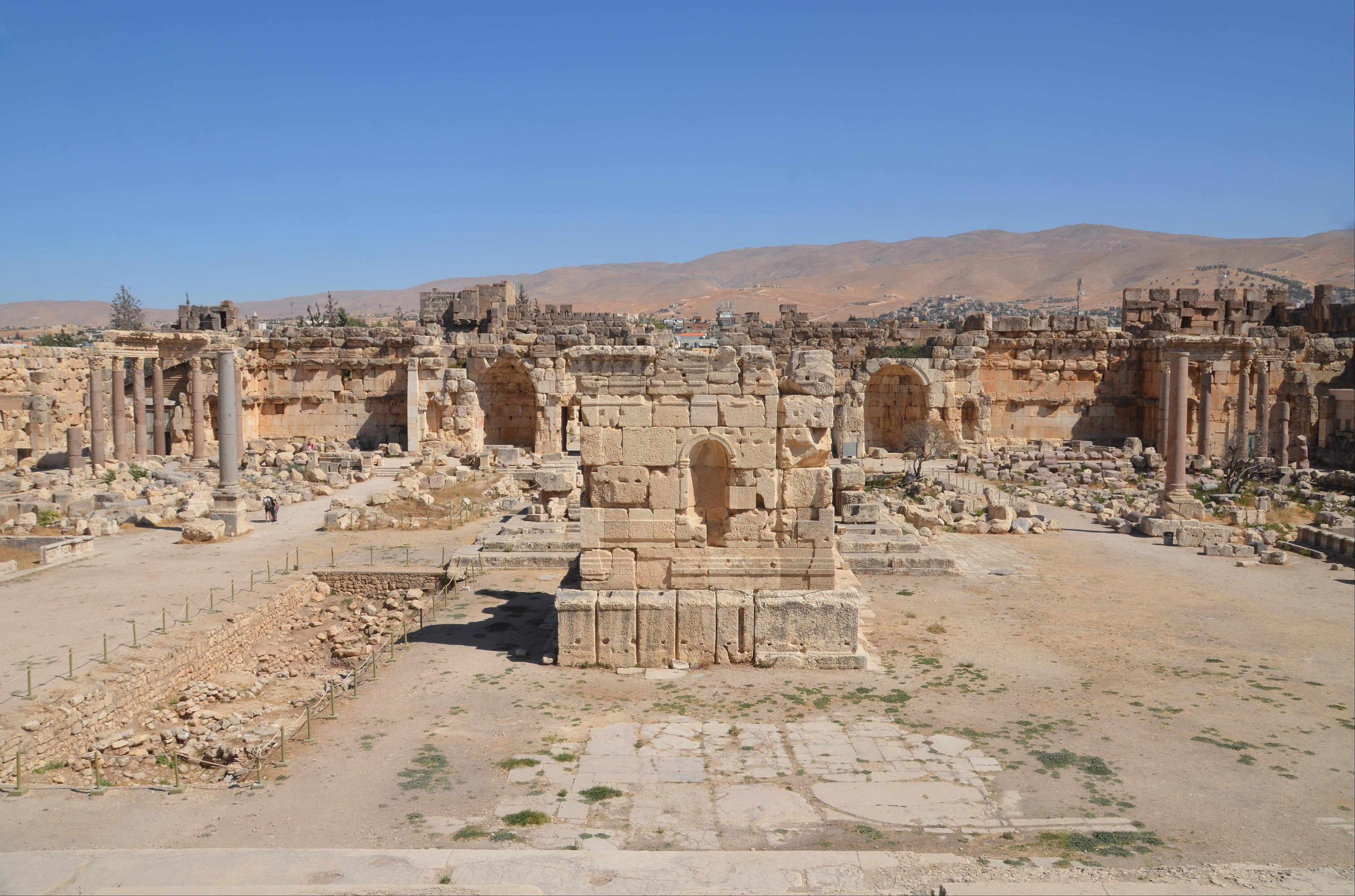 An overview of the Great Courtyard of the Temple of Jupiter Heliopolitanus at Baalbek (Heliopolis) with two monumental altars and two water basins within a porticoed enclosure. It covers a vast area of some 134 m by 112 m (439 ft by 367 ft).
