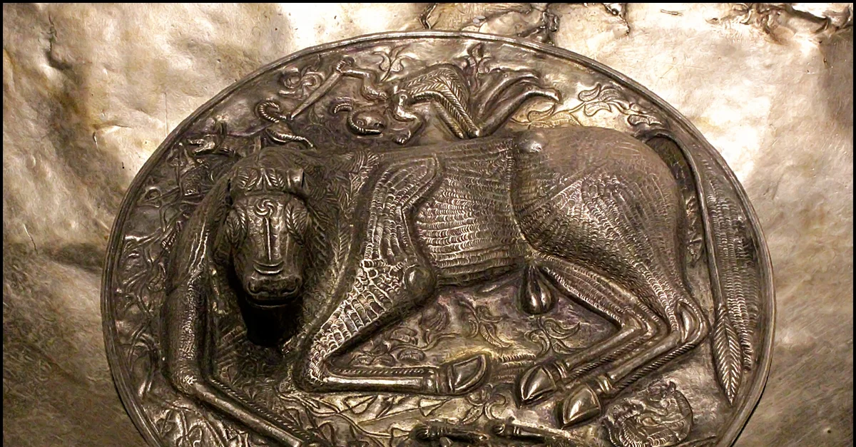 The Gundestrup Cauldron was found in Denmark in 1891 CE but was produced in the Balkans. Gilded silver, likely 1st century BCE. The designs show gods and warriors inspired by the Celtic culture. (National Museum of Denmark, Copenhagen)