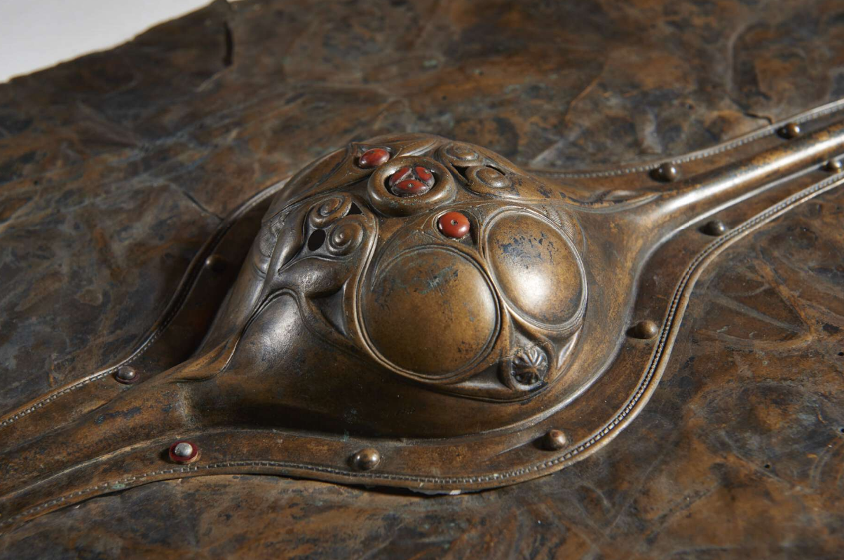 A detail of the bronze Witham Shield showing the central boss with its red coral and repoussé decoration. Britain, 400-300 BCE. (British Museum, London)