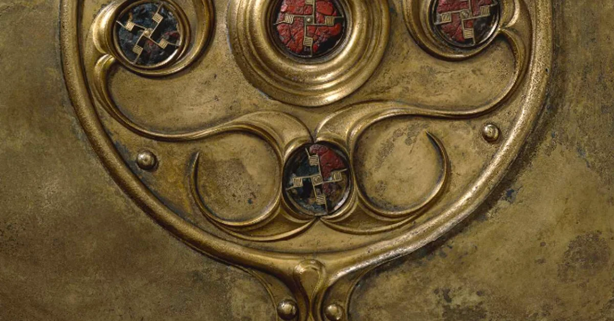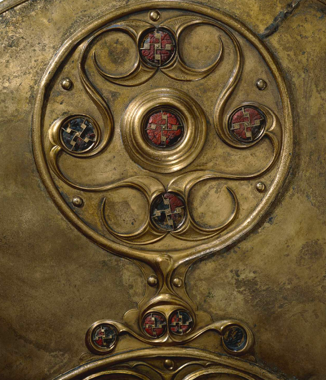 A detail of the Battersea Shield, a bronze covering once attached to a wood or leather backing. The red elements are glass paste. Likely made in Britain, 350-50 BCE. (British Museum, London)