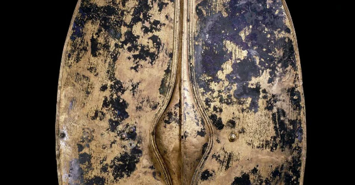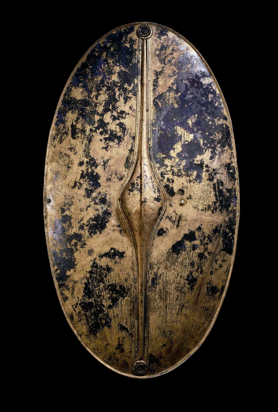 The bronze Chertsey Shield was discovered accidentally in 1985 in a silted-up channel of the River Thames in Abbey Meads, Surrey, England. It was made in the period 400-250 BCE. It measures 83.6 cm (33 in) in height and 46.8 cm (18.5 in) in width.