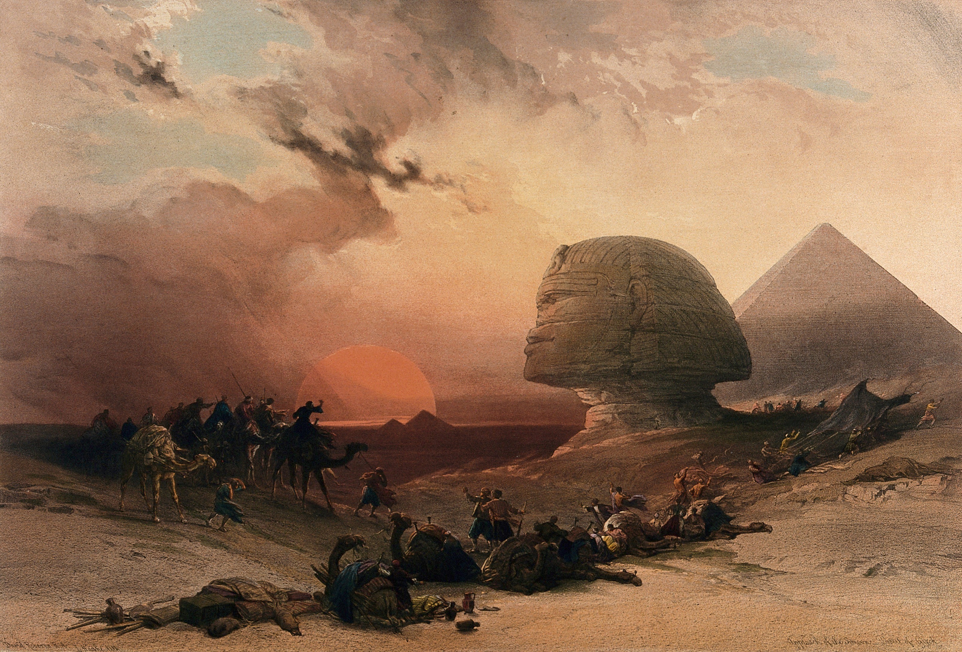 Sandstorm approaching the sphinx at Gîza at sunset, Egypt. Coloured lithograph by Louis Haghe after David Roberts, 1849 CE.