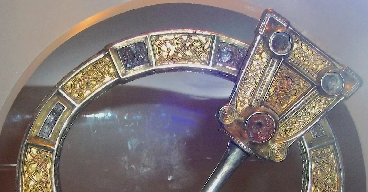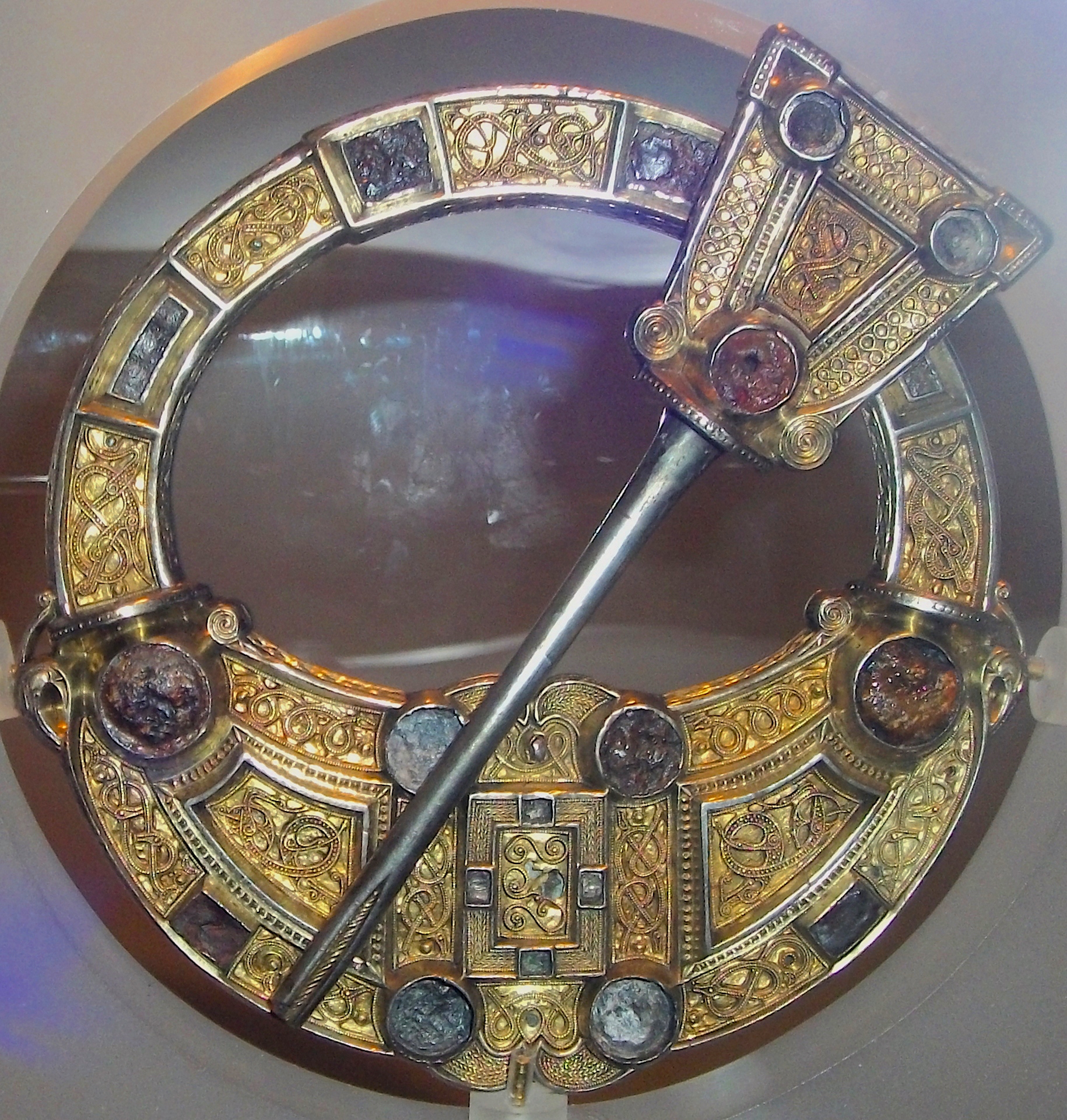 The Hunterston Brooch, a Celtic penannular brooch discovered in Ayrshire, Scotland c. 1830 CE. It was made c. 700 CE and is 12 centimetres (4.75 in) in diameter. The brooch is made of cast silver with gold, silver and amber additions. (National Museum of Scotland, Edinburgh)