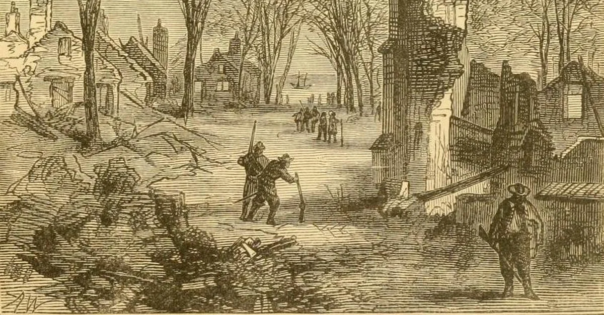 The engraving depicts the ruins of Jamestown following Bacon's Rebellion of 1676 CE during which Jamestown was burned to the ground. This event was the climax of the rebellion after which it dissipated when its leader, Nathaniel Bacon, died of dysentery. Other major participants were then hanged by Governor George Berkeley.
