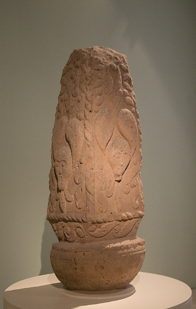 A fine early example of the Celtic carved pillar is the 5th-4th century BCE Pfalzfeld Pillar from near St. Goar, Germany. The pillar is 1.48 metres (4 ft 8 in) tall and was once topped by a head. Divided into four sides by vertical cable reliefs, each face has a human head wearing a headdress known as a ‘leaf crown’ and a stylized beard of three points. The spaces are filled with geometric designs. (Rheinisches Landesmuseum, Bonn).