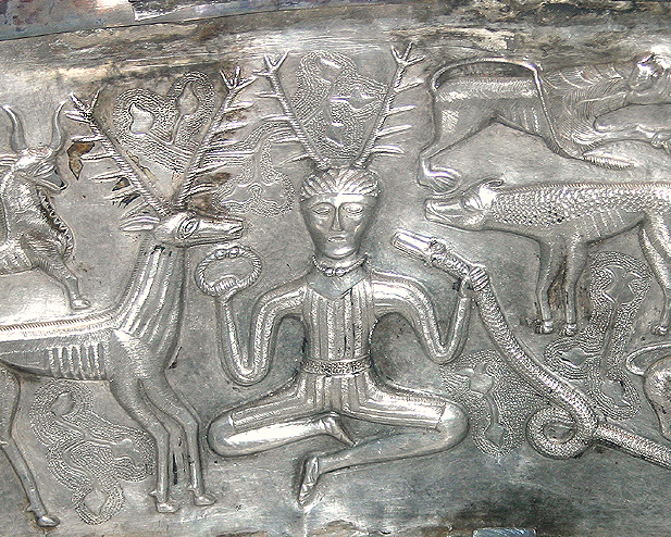 The horned-figure frequently identified as the Celtic god Cernunnos. A detail from an interior panel of the Gundestrup Cauldron. The cauldron was found in Denmark in 1891 CE but was produced in the Balkans. Gilded silver, likely 1st century BCE. The designs show gods and warriors inspired by the Celtic culture. (National Museum of Denmark, Copenhagen)