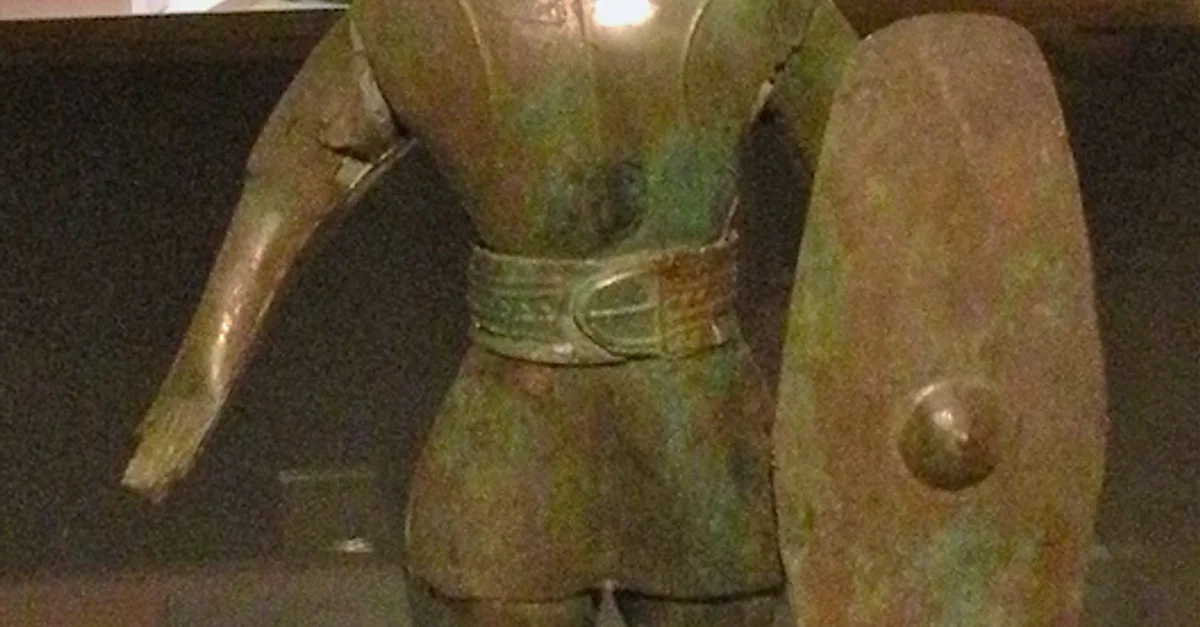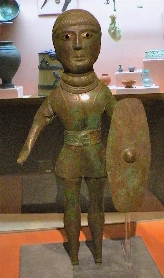 A Celtic warrior statue from Gaul. Bronze with glass inlay, 1st century BCE or 1st century CE. From Saint-Maur-en-Chaussée, Oise, France. (Musée départemental de l'Oise)