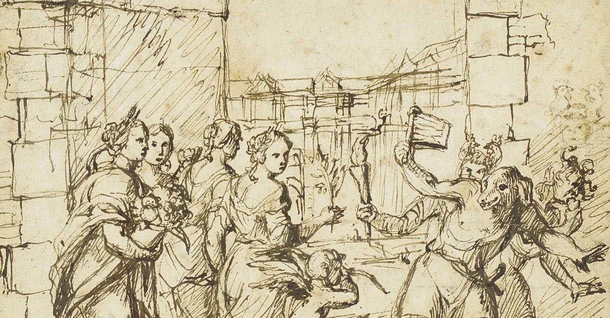 The Lupercalian festival in Rome: Cupid and Personifications of Fertility encounter the Luperci dressed as dogs and goats, a pen and ink drawing by the Circle of Adam Elsheimer (1578-1610).