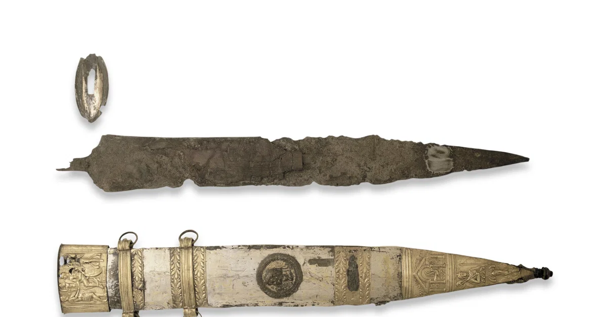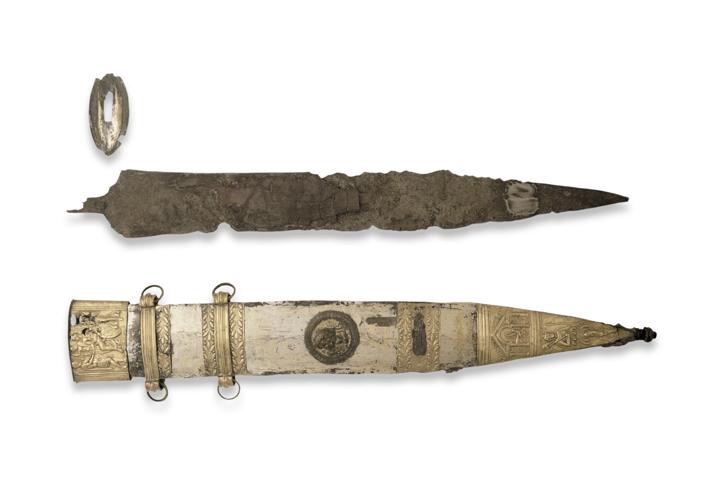 The ornate sheath depicts the Roman general (and future Roman emperor) Tiberius (r. 14 to 37 CE) symbolically ceding victory to Augustus (r. 27 BCE - 14 CE). The Roman war god Mars and the goddess Nike, the personification of Victory, are also pictured. It was likely commissioned by an officer of the Roman army to commemorate a victory over the Germanic people in the Alps region.