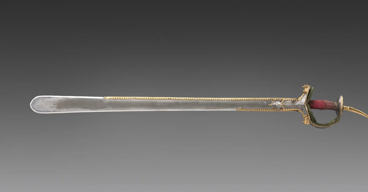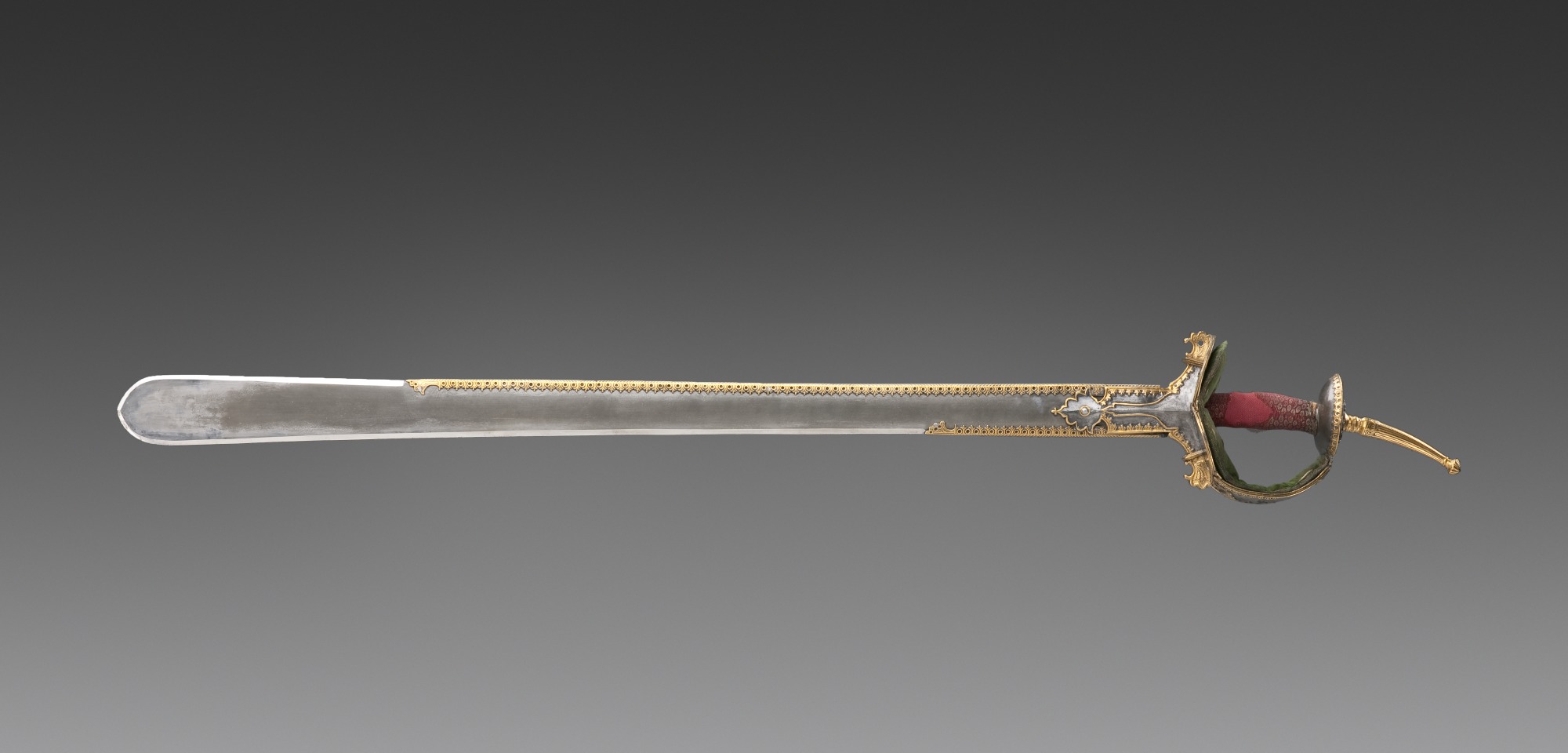 The khanda is a type of double-edged straight sword originating in the Gupta Empire c. 320-550 CE. The khanda is used in many forms of Indian martial arts, and its symbolism carries religious and cultural significance. This example has the khanda's characteristic blunt tip and strengthening plate along one edge. Iron blade, with gold and textile decorations on the hilt, and gilded designs along the blade. Made in India, c. 18th Century CE. 98.1 x 8.3 cm (38.6 x 3.2 in). Image courtesy of the Detroit Institute of Art.