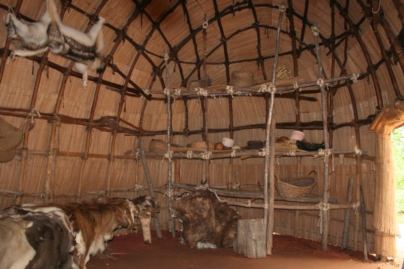 Interior of a reconstructed Powhatan longhouse (yehakin) in the living history museum Jamestown Settlement, Jamestown, Virginia.
