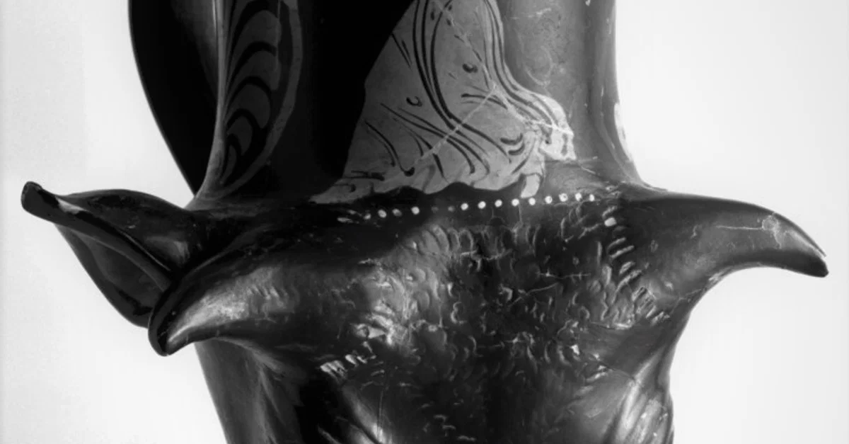 Horn-shape drinking vessels are among the earliest finer artefacts developed in various civilisations. From the 2nd millennia BCE onwards, they appear in and around the Near East and Central Asia with zoomorphic heads shaped as boars, lions and lionesses, goats, panthers, and bulls. Following the defeat of the Persians by the Greeks in 479 BCE, Persian horn-pitchers of gold, silver, and ivory were introduced to the Greeks and adopted by them under the name of rhyton (roughly meaning ‘pourer’ or ‘pouring vessel’). Ceramic rhyta from mainland Greece and its colonies in South Italy were often decorated around the neck with mythical scenes and characters related to wine-drinking, wine-god Dionysos, dancing, and revelry. This bull-head rhyton is an example, displaying a female dancer, perhaps a maenad, dancing with a tympanon.