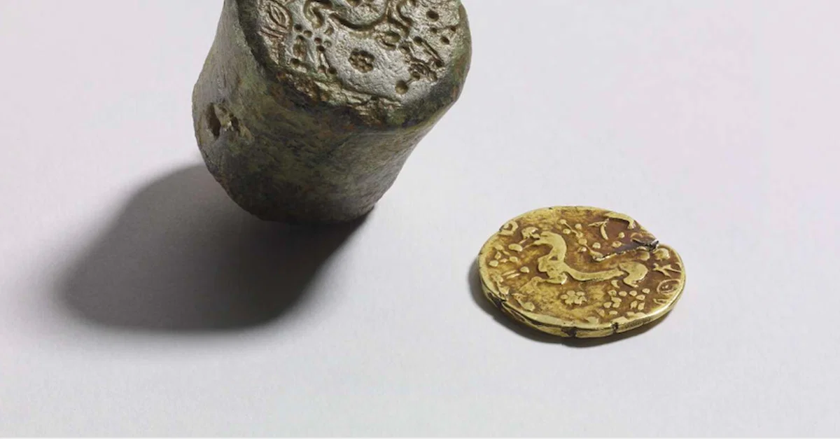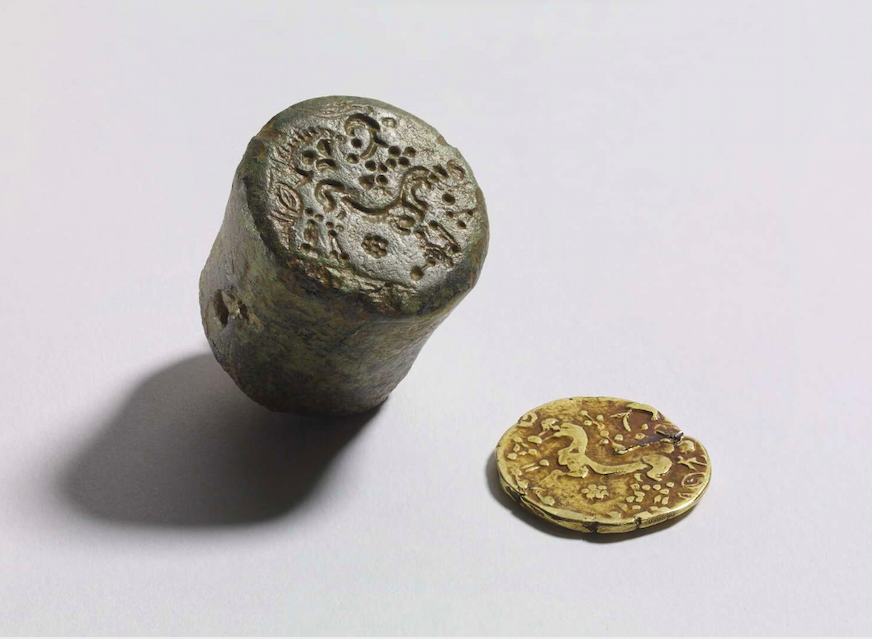A Celtic coin die and gold coin showing a horse design from Bredgar, Kent, England, 2nd century BCE.