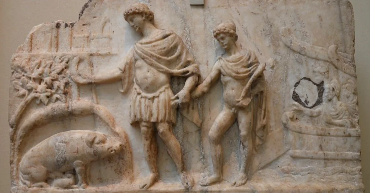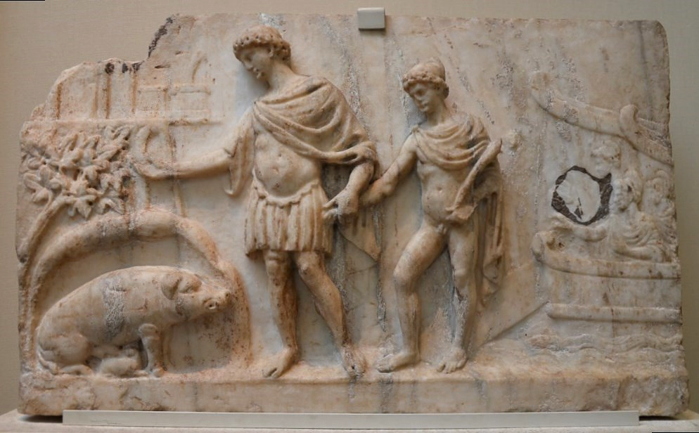 Roman bas-relief depicting the arrival of Aeneas and his Trojan companions in Italy, made about 140-150 CE. Aeneas is landing on the shores of Latium with his companions. His son Ascanius is behind him. On the left is the sow who tells him to found his city at Rome. British Museum, London.