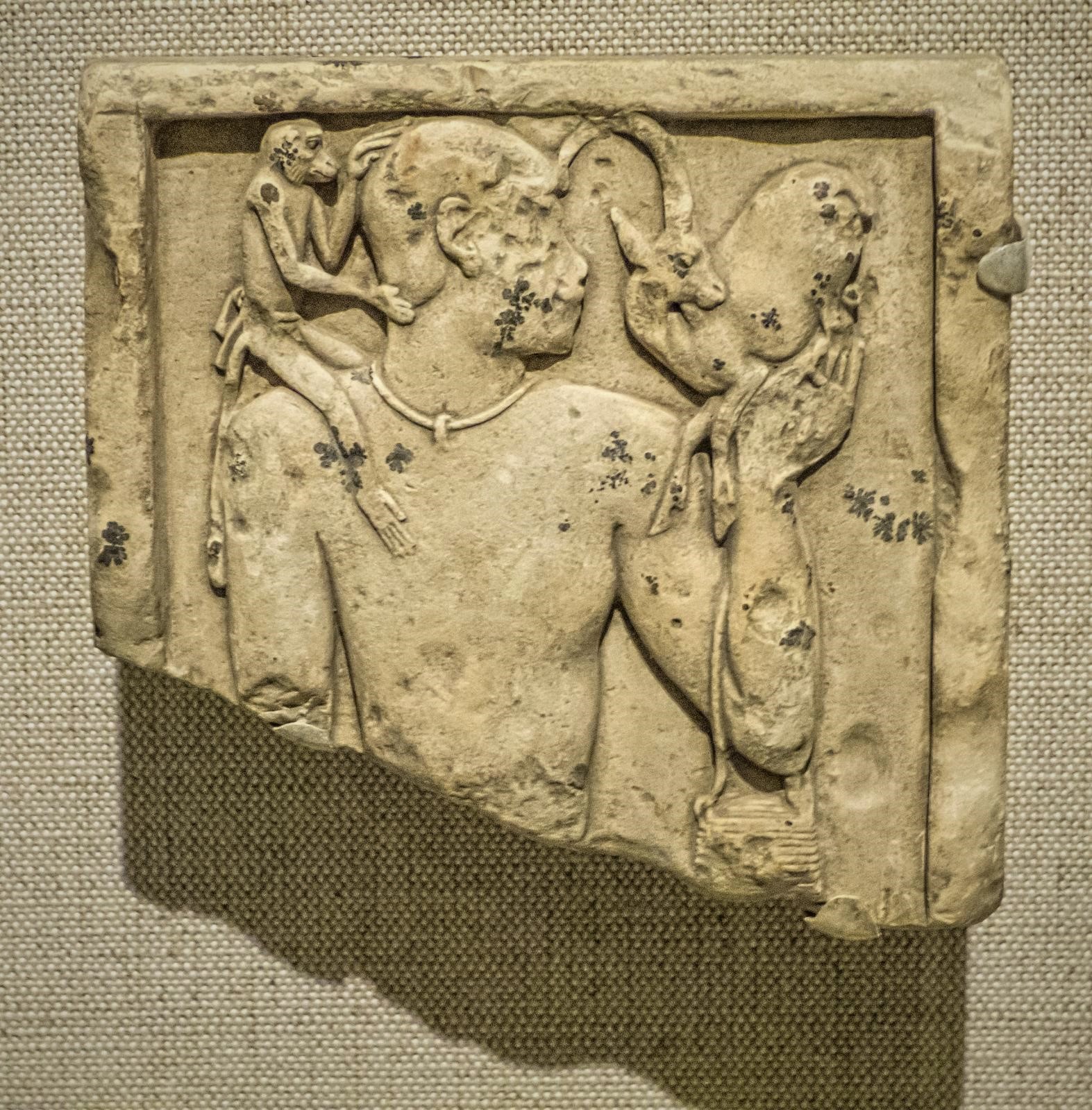 Egyptian plaque depicting a man holding an ibex, while a monkey perches on his shoulder. Limestone. Memphis, Egypt. Ptolemic period, 300-27 BCE. Collection of the Walters Art Museum.