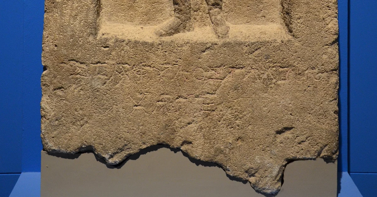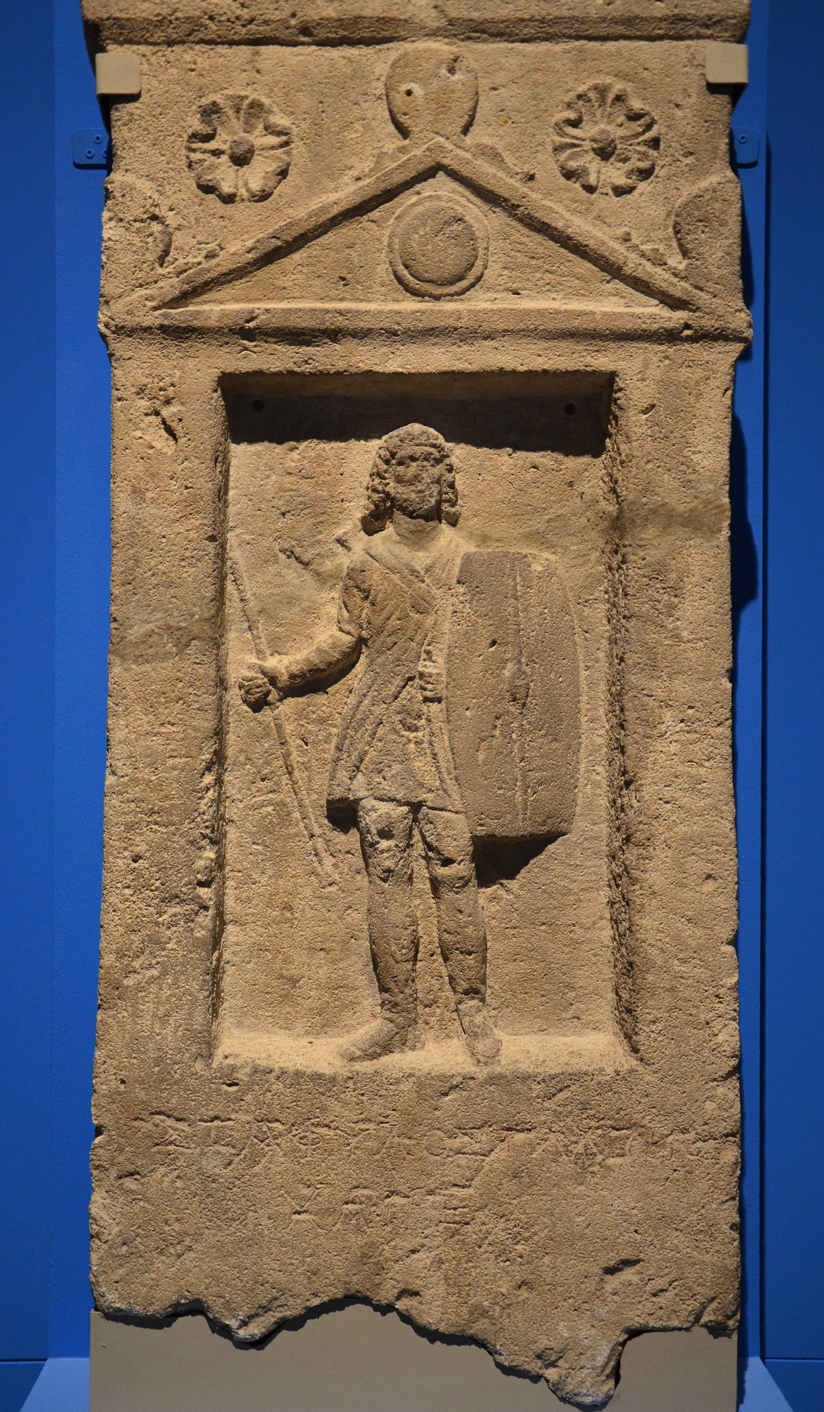 Grave stele of Staphilos, son of Glaukias, from the Bosporan Kingdom. It depicts a soldier with the traditional Bosporan long hair and beard, and Scythian costume. It dates to the 2nd century CE and comes from the Necropolis of Panticapaeum in Taurica (Crimea).