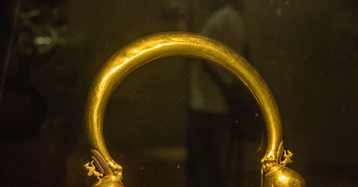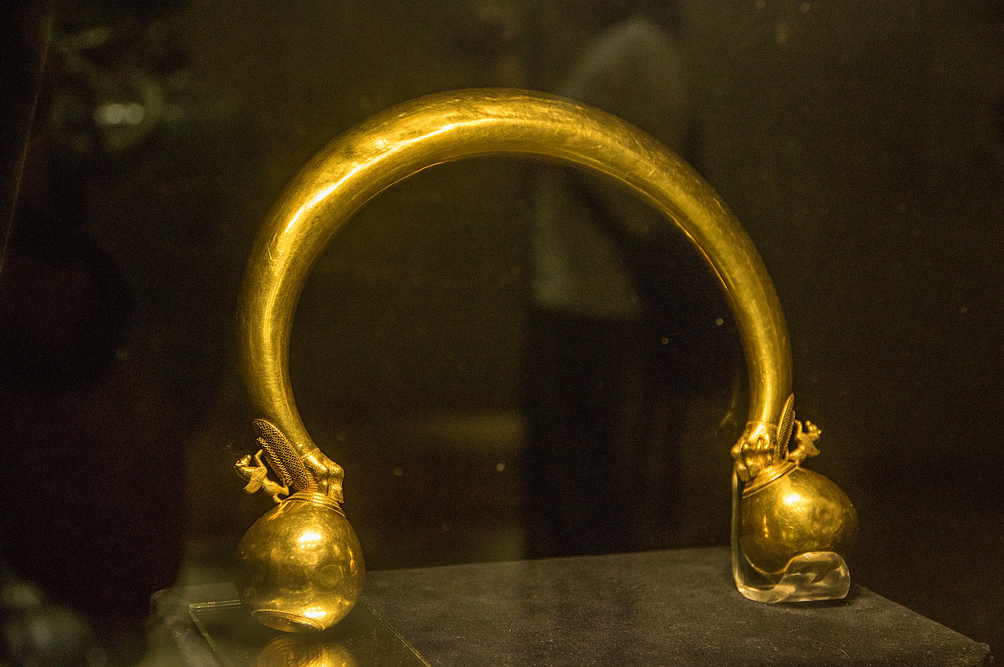 A gold neck torc from the Celtic Vix burial, Châtillon-sur-Seine, in northeast France close to a fortified Celtic site or oppidum and in the vicinity of at least four more burials. Discovered undisturbed, the princely burial dates to the late 6th- or early 5th century BCE
