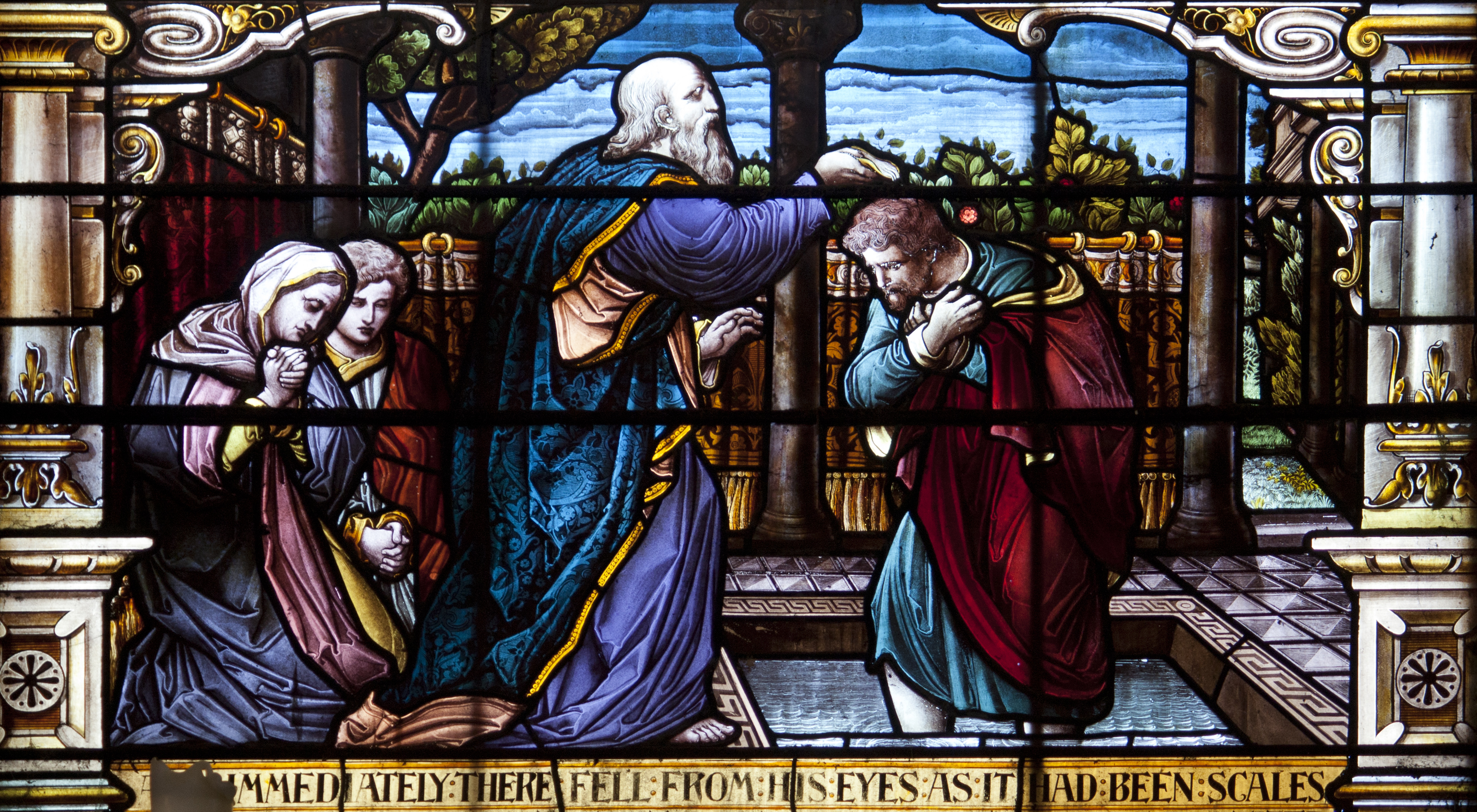 Ananias baptizes Paul the Apostle as depicted in a detail from a stained glass window in St Paul's church, Jericho in Oxford.