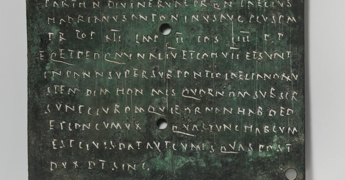 Bronze military diploma of an infantryman named Dasmenus Azalus, who served in the auxiliary units of the Roman army. Issued c. 149 CE.