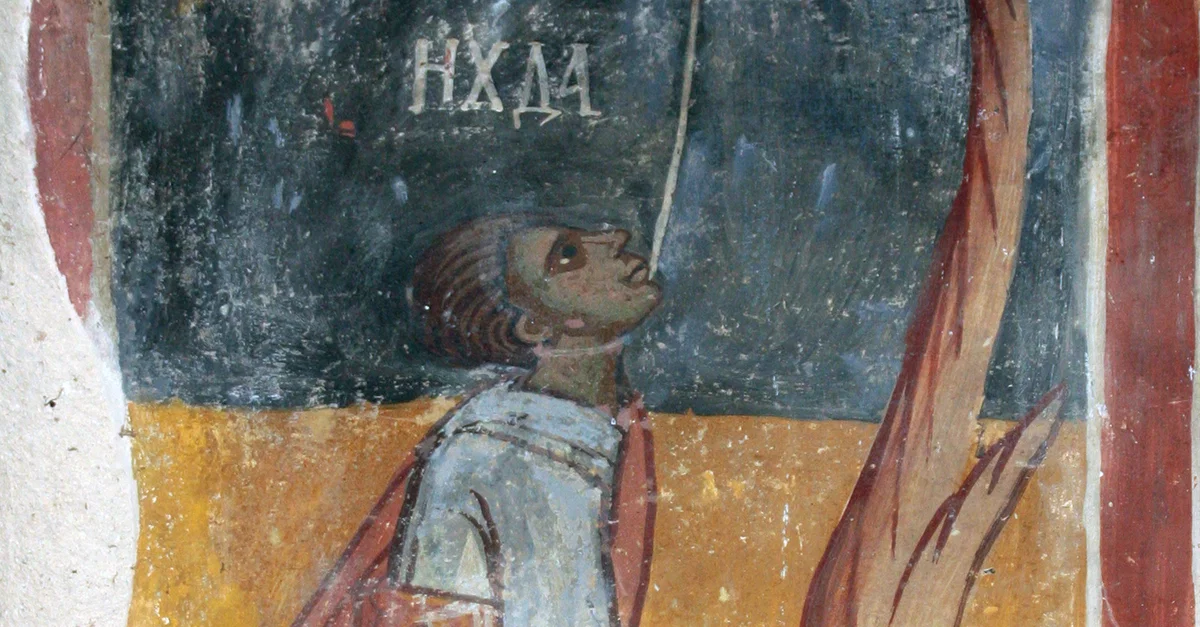 A fresco showing Judas Iscariot hanging himself from a tree as recounted in the New Testament's Book of Mathew. 16th century CE. Tarzhishte Monastery, Strupets, Bulgaria.