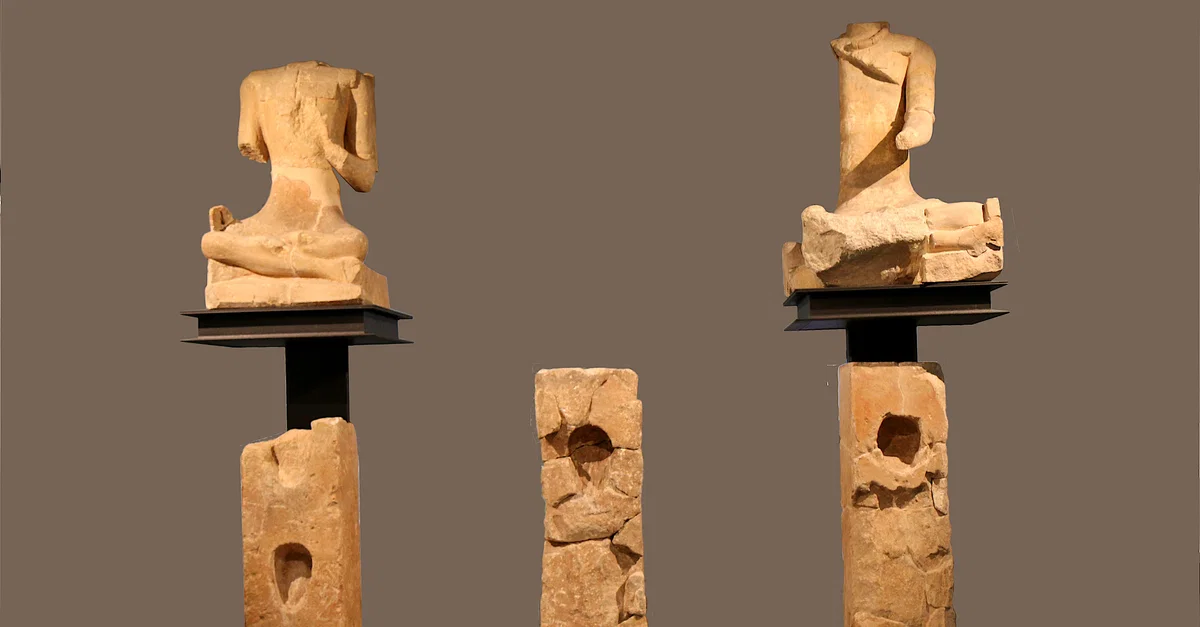 Seated figures and stone columns with niches for human heads or skulls from a Celtic religious site at Roquepertuse, France. 3rd century BCE. (Musée d'histoire, Marseille, France)