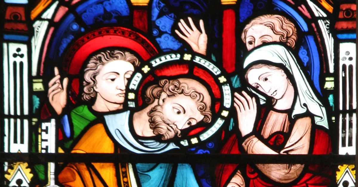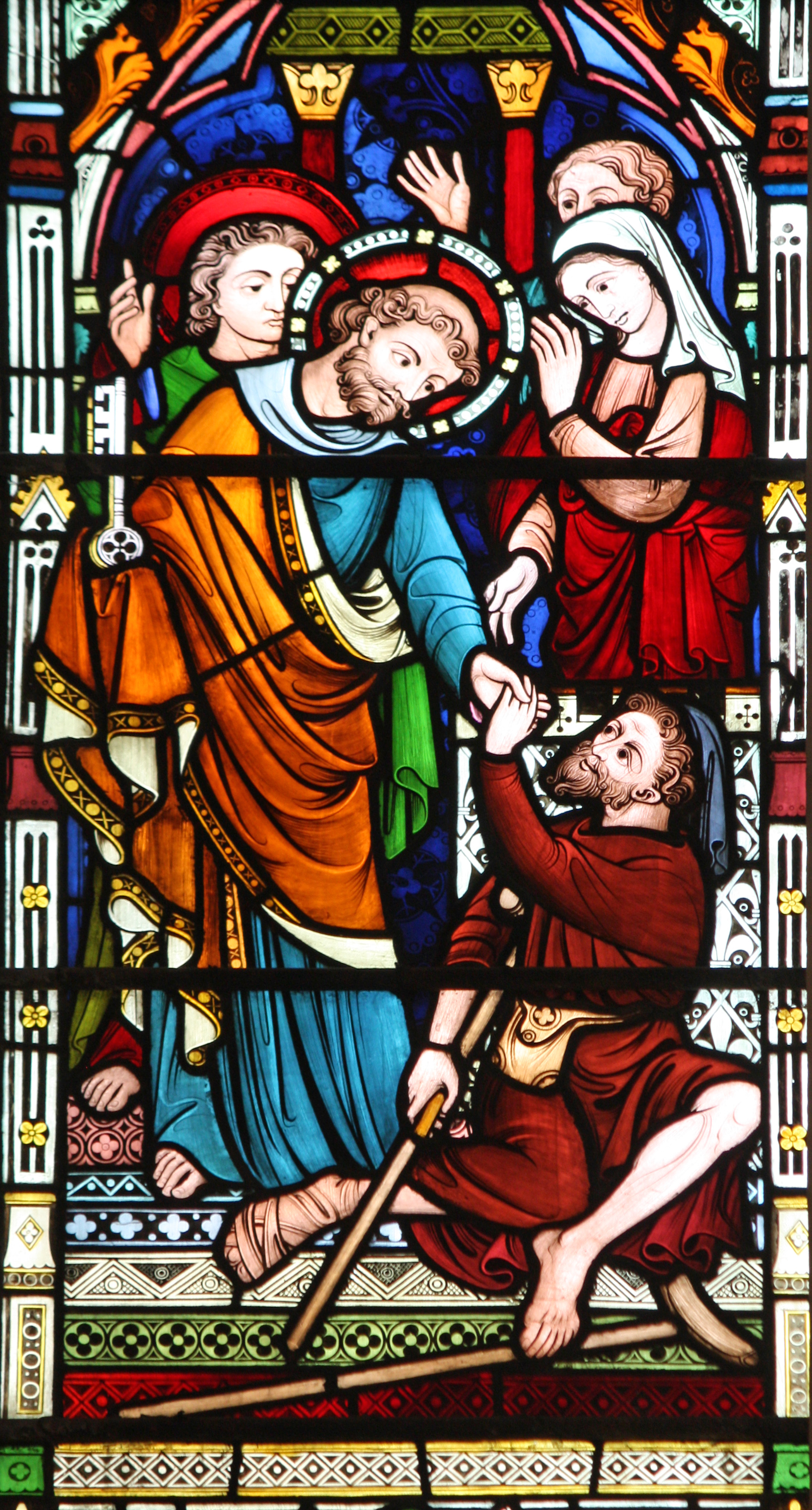 Detail from a window depicting Saint Peter healing a cripple in Exeter College Chapel, Oxford.