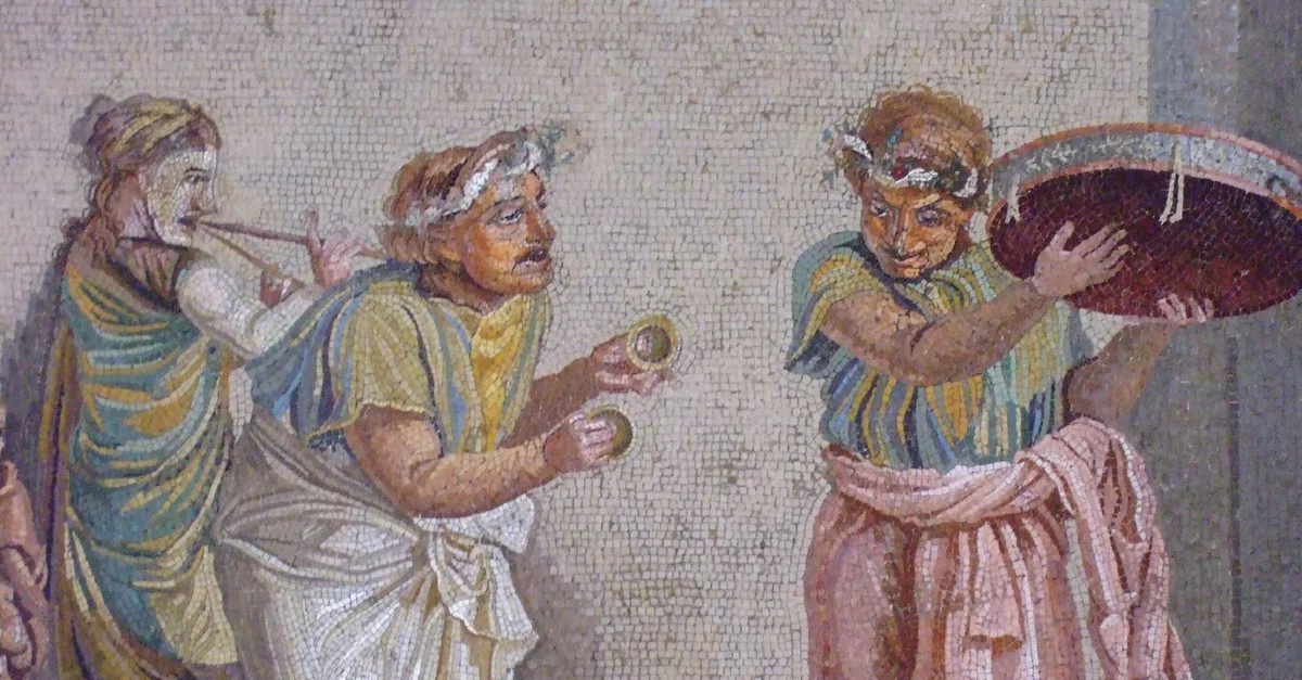 A Roman mosaic depicting a troupe of comic performers, wearing masks and playing musical instruments. The figure on the left plays a pan flute, while the figure on the right plays a tympanon (hand drum). From the "Villa of Cicero", Herculaneum. 1st Century CE.