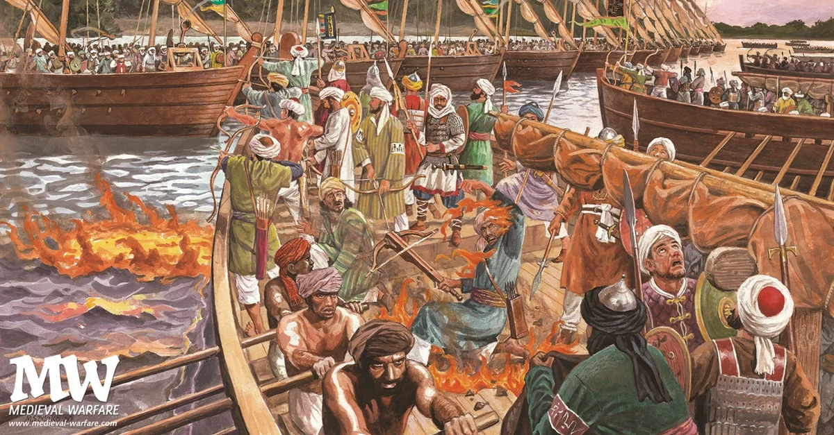 Illustration of the 1366 battle on the Nile river, fought between the forces of the Mamluk emir Yalbugha (c. 14th Century CE-1366 CE) and the Sultan Al-Ashraf Sha'ban (r. 1363–1377).