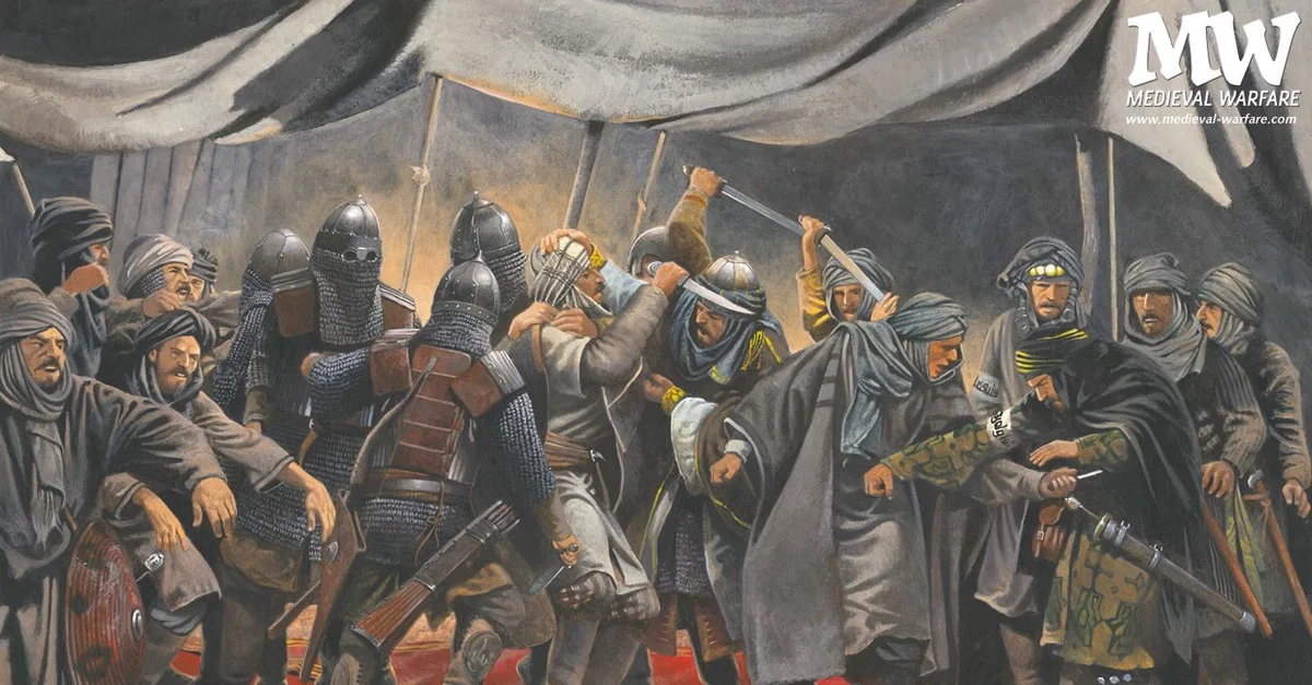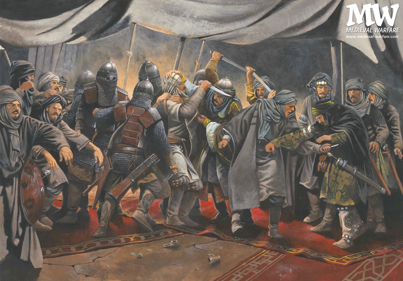 Illustration of the second attemopt to assasinate Saladin (r. 1174-1193 CE), in 1176 CE. Illustrated by by Zvonimir Grbasic. Courtesy of Medieval Warfare Magazine / Karwansaray Publishers.