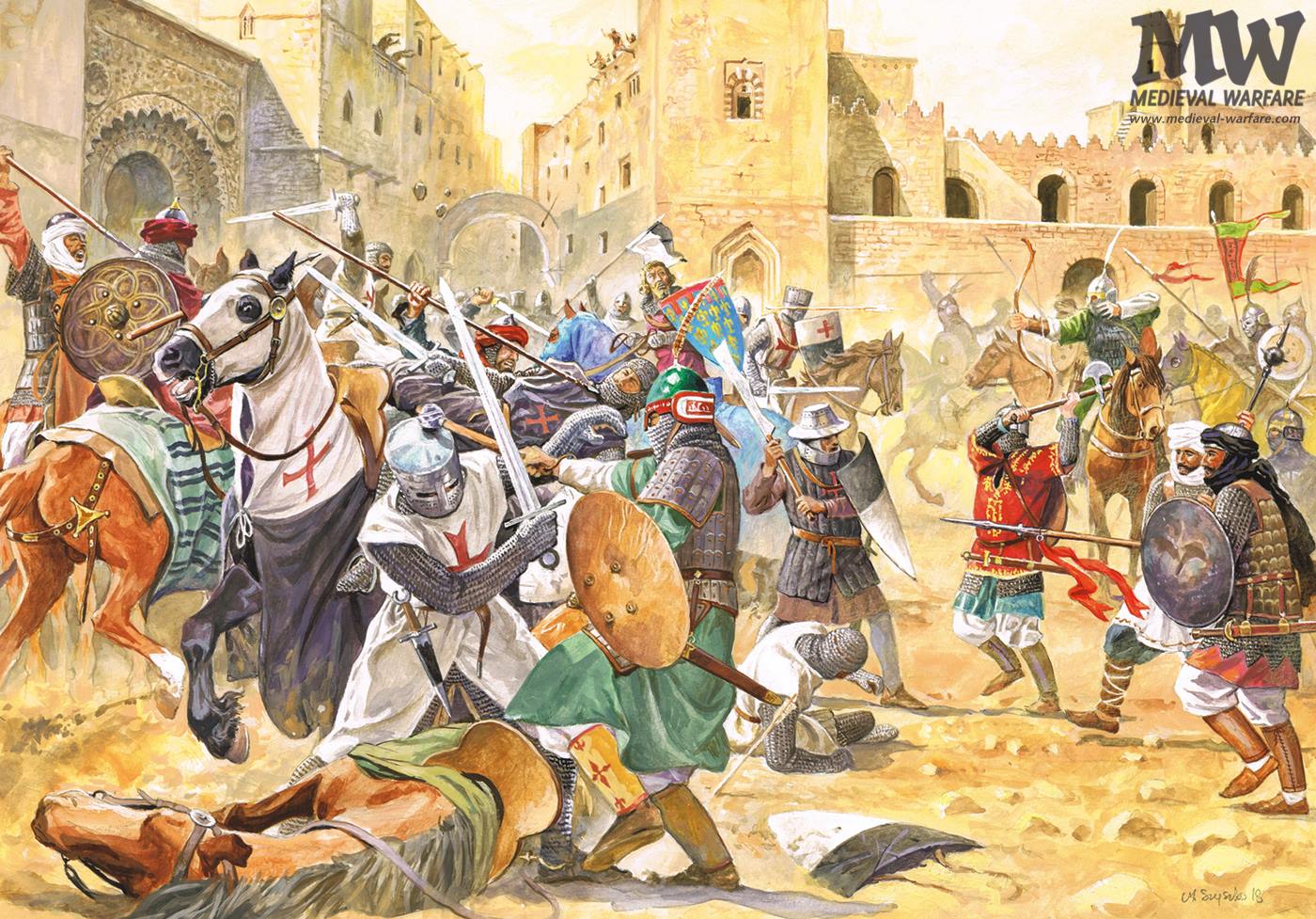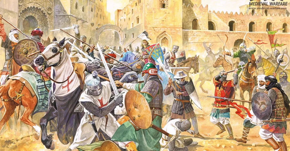 Illustration of the Battle of Mansura (1250 CE) during the Seventh Crusade, by Marek Szyszko. Courtesy of Medieval Warfare Magazine / Karwansaray Publishers.