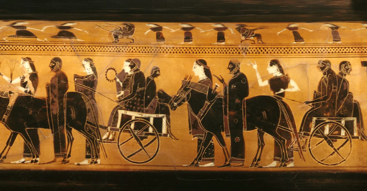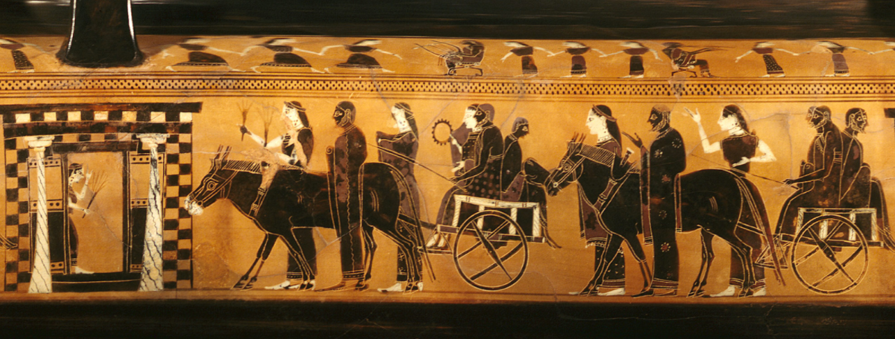 Dated as being from 550-530 BCE, this Attic Greek lekythos depicts a wedding procession. Attributed to the Amasis Painter. Now housed in The Metropolitan Museum of Art.