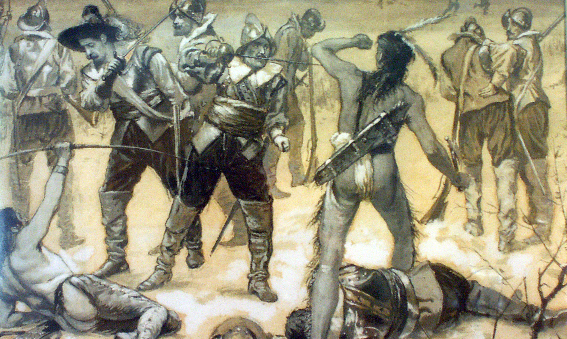 Lieut. Lion Gardiner Attacked by "Pequot" Indians at Saybrook Fort 22 Feb 1637, watercolor on paper by Charles Stanley Reinhart, 1890.