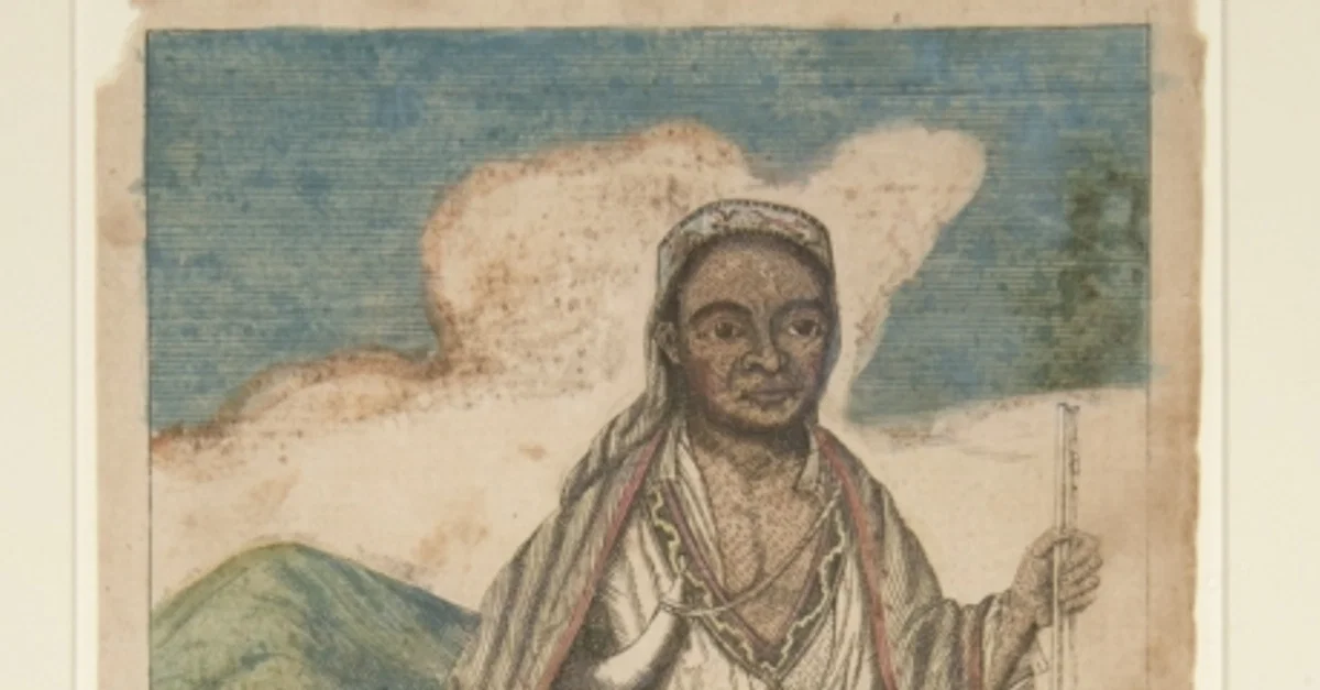 Philip, King of Mount Hope, line engraving depicting Metacom (also known as King Philip, l. 1638-1676), colored by hand, by the American engraver and silversmith Paul Revere, illustration from page 88 of The Entertaining History of King Philip's War by Benjamin Church, Soloman Southwick; Newport, R.I., USA, 1772.