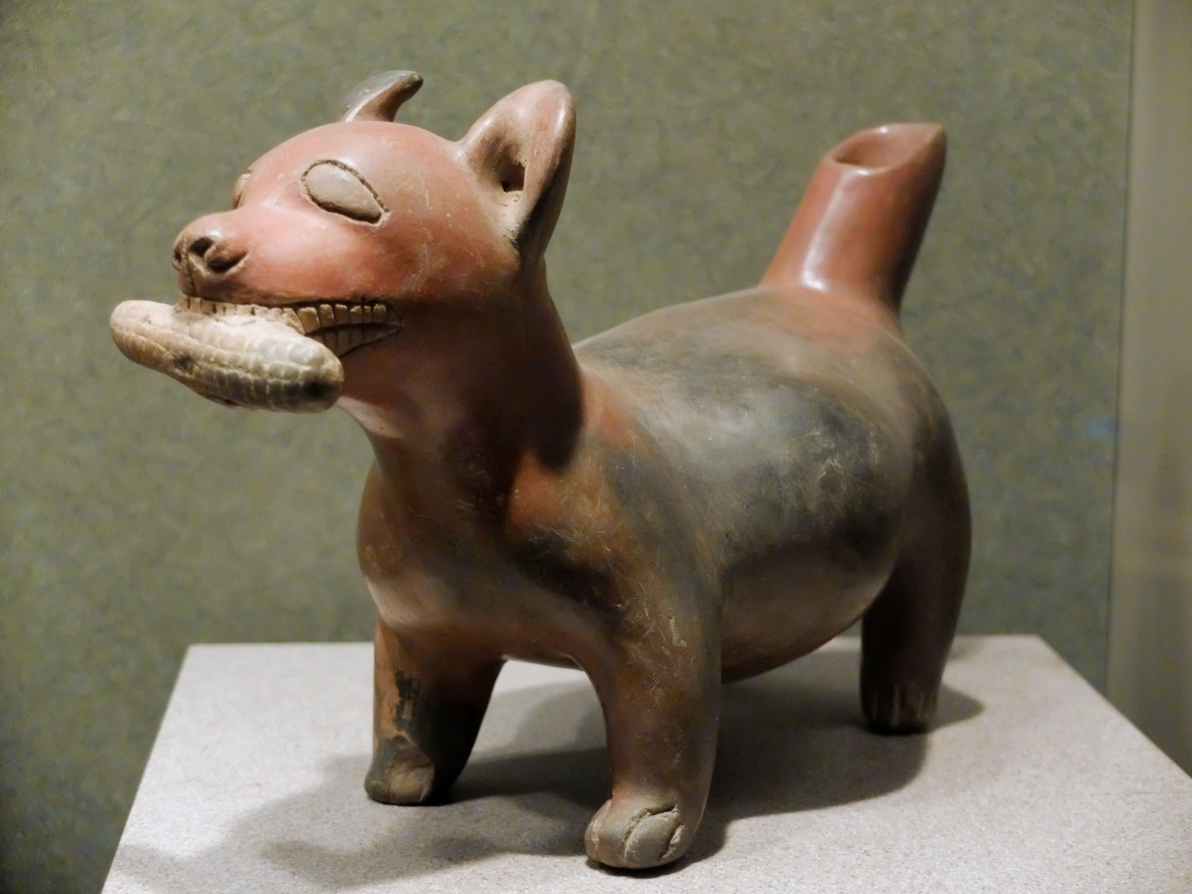Statue of a dog holding a cob of maize (corn) in its mouth. c. 100 BCE-300 CE. Associated with the Comala people. From Colima, Mexico. Collection of the National Museum of Anthropology, Mexico City.
