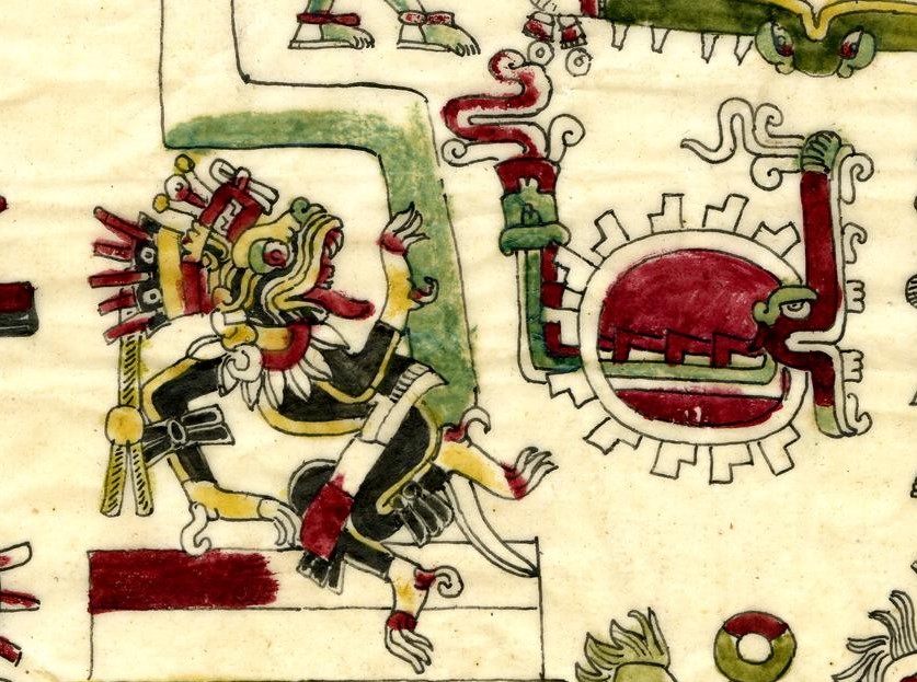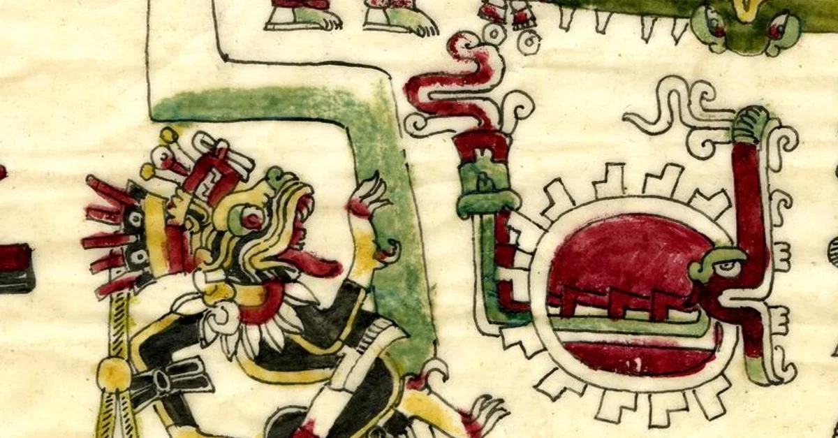 Painting of the dog-headed Aztec god Xolotl with the fire serpent Xiuhcoatl, from a facsimile of the pre-Hispanic Borgia Codex, 16th century.