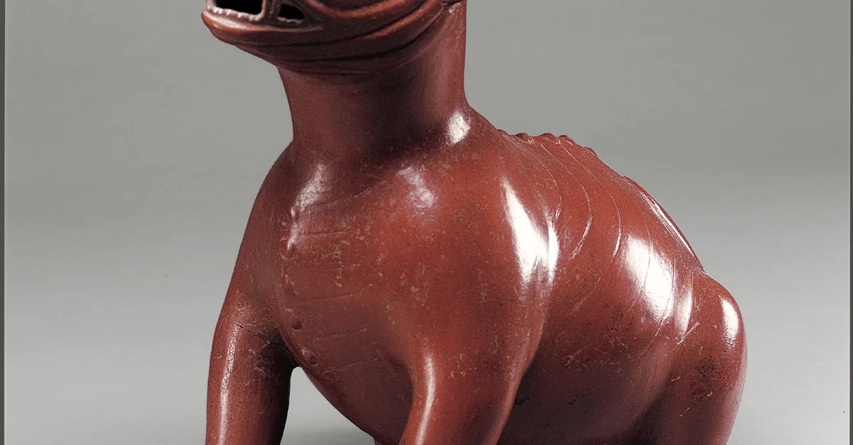 Ceramic sculpture of a snarling dog. Associated with the Comala people. Colima, Mexico. c. 200 BCE-300 CE. Collection of the Metropolitan Museum of Art.