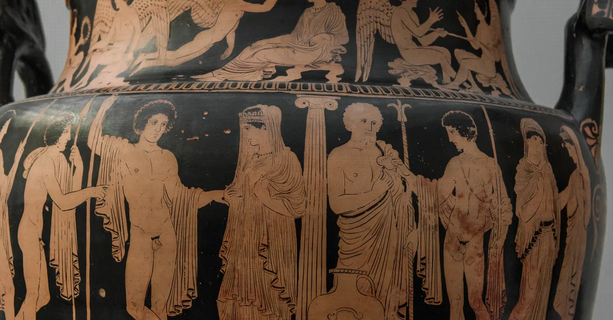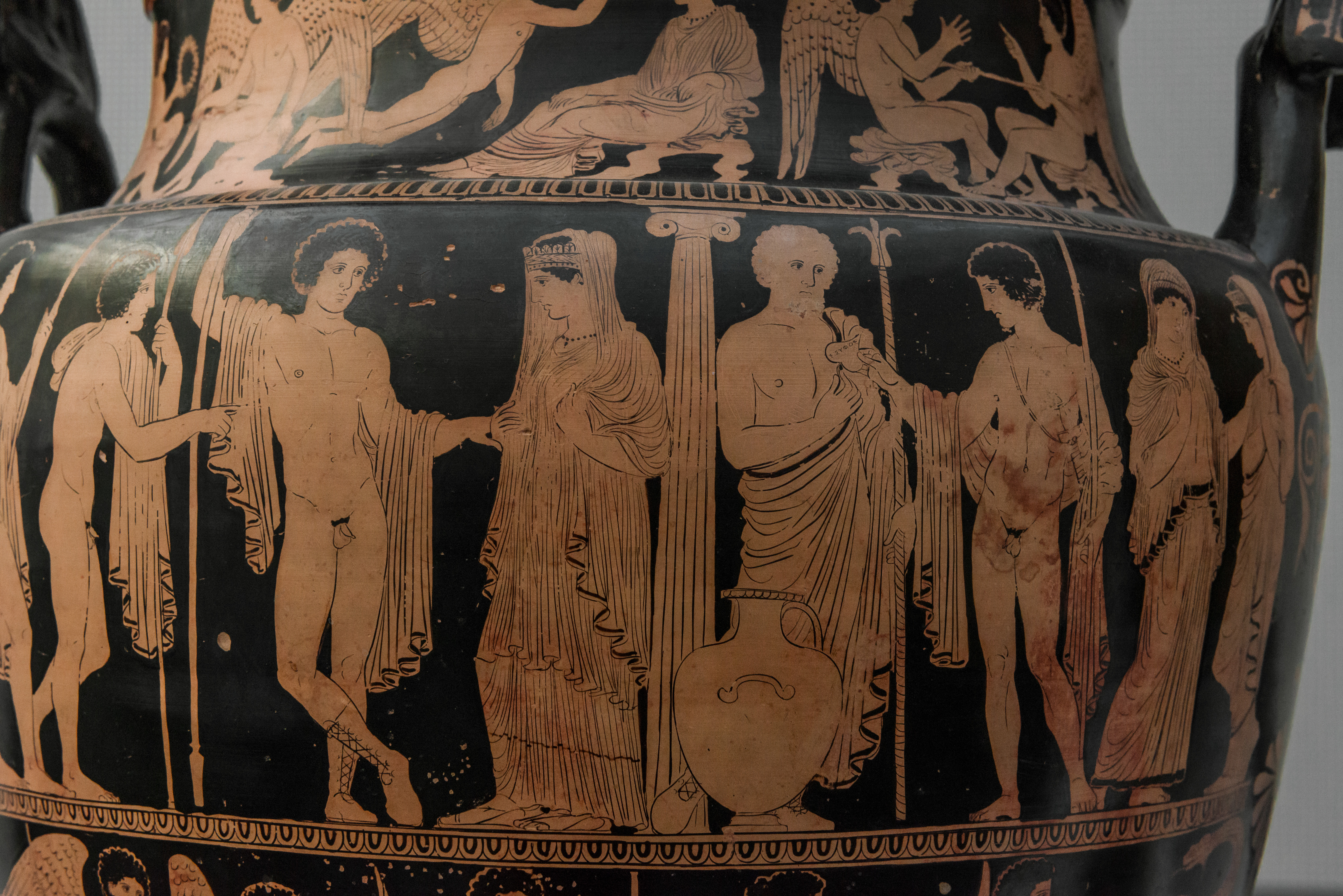 Greek vase depicting the wedding of Laertes and Anticlea, the parents of the mythological hero Odysseus. An Ionic column splits the scene into two parts. On the left register, Laertes takes the hand of his bride, Anticlea. On the right register, Autolycus, father of Anticlea, stands speaking to three figures.