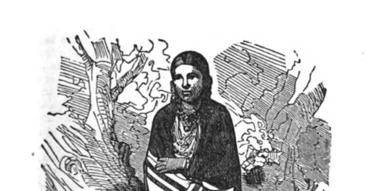 Drawing of Weetamoo (l. c. 1635-1676) from page 48 of Frost's Pictorial History of Indian Wars and Captivities by John Frost, 1873.