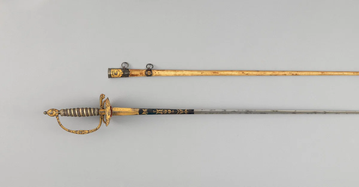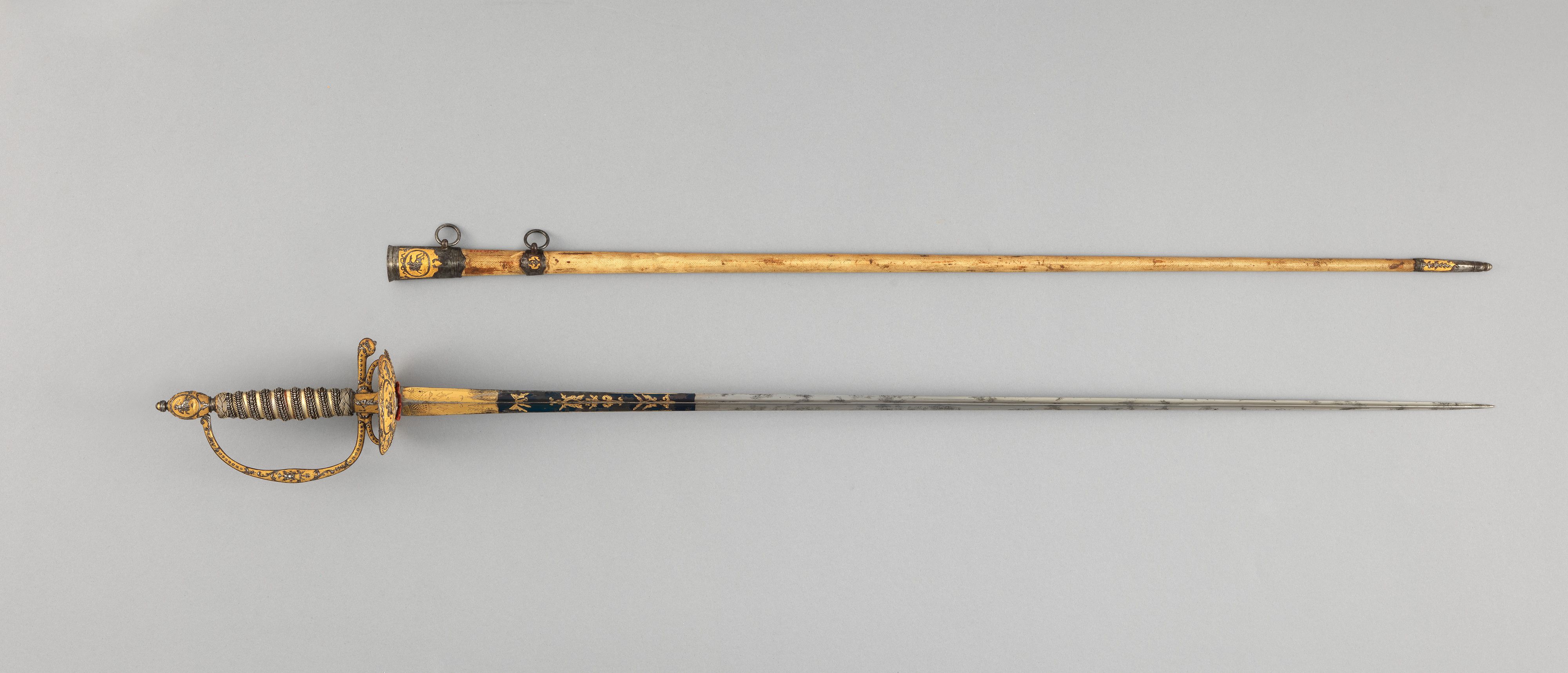 Steel blade. Hilt and scabbard decorated with silver, gold, wood, textile, and fishskin. Made in Paris by C. Liger (l. c. 1770–93 CE). Dated c. 1780 CE. 96.8 cm (38 1/8 in) x 11.4 cm (4 1/2 in). Weight: 368.54 g (13 oz). Collection of the Metropolitan Museum of Art.