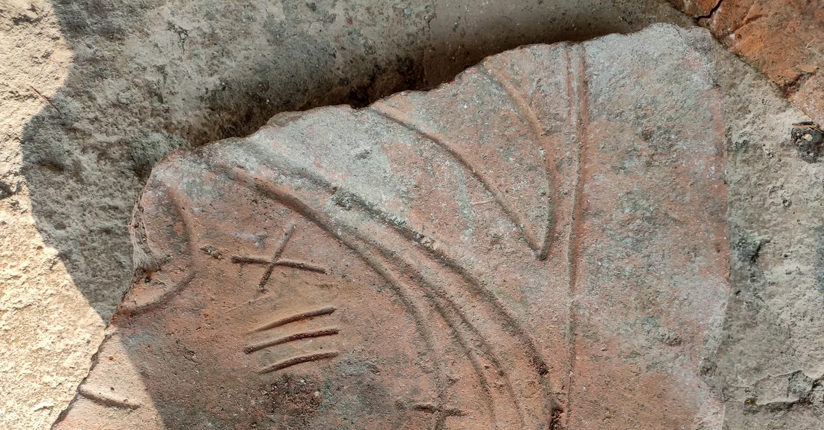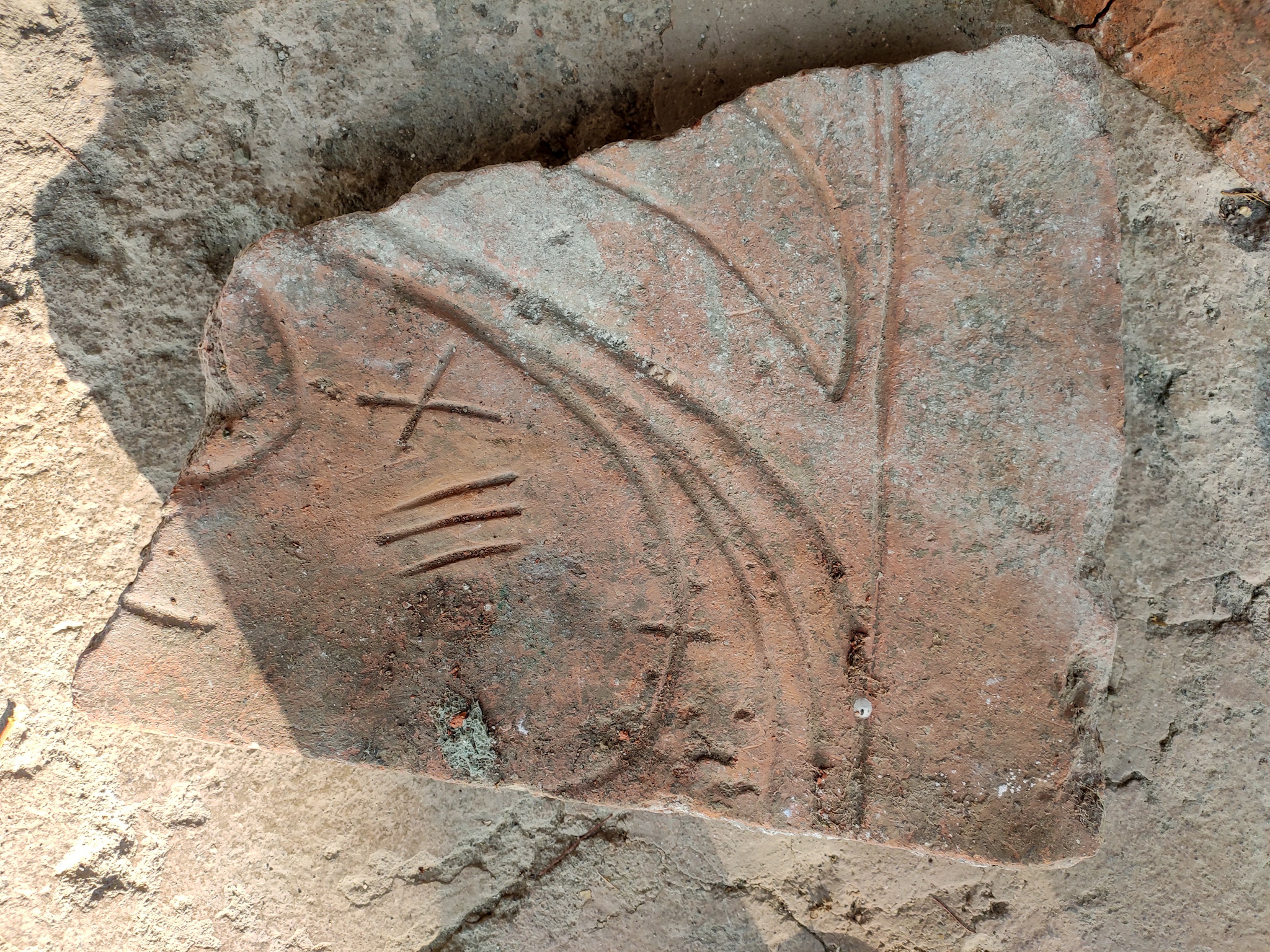 A fragmented tile found in the complex, impressed with Kharoshti numerals. From the Harwan Monastery in Kashmir, India.