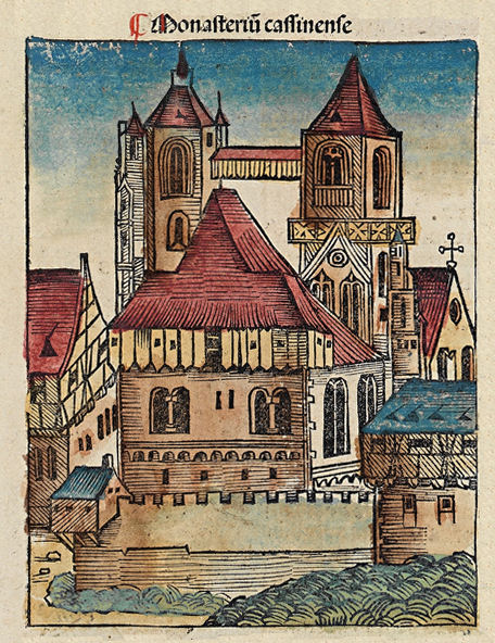 Illustration of Monte Cassino in the 15th-century Nuremberg Chronicle. Published in Nuremberg, Germany, 1493.