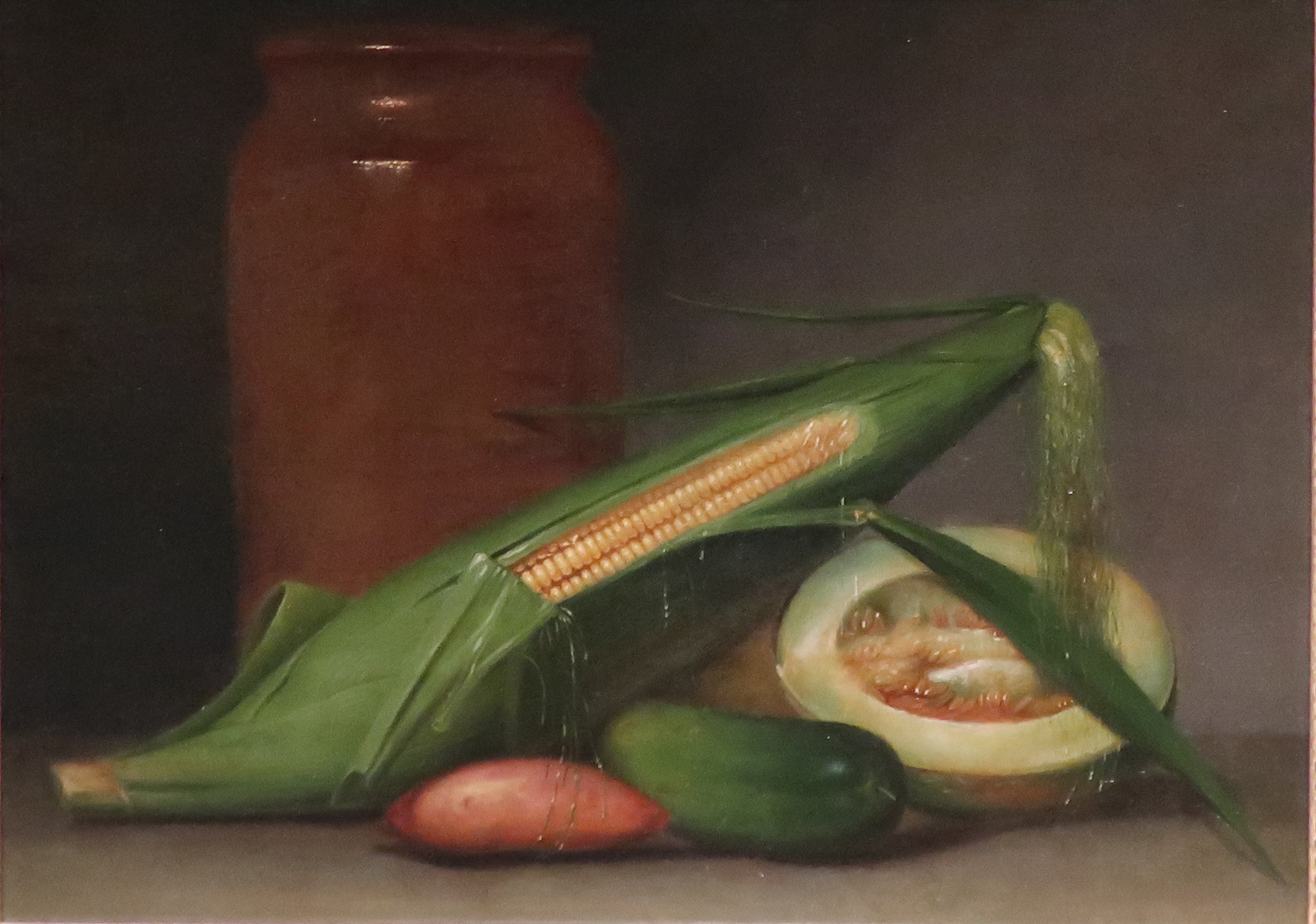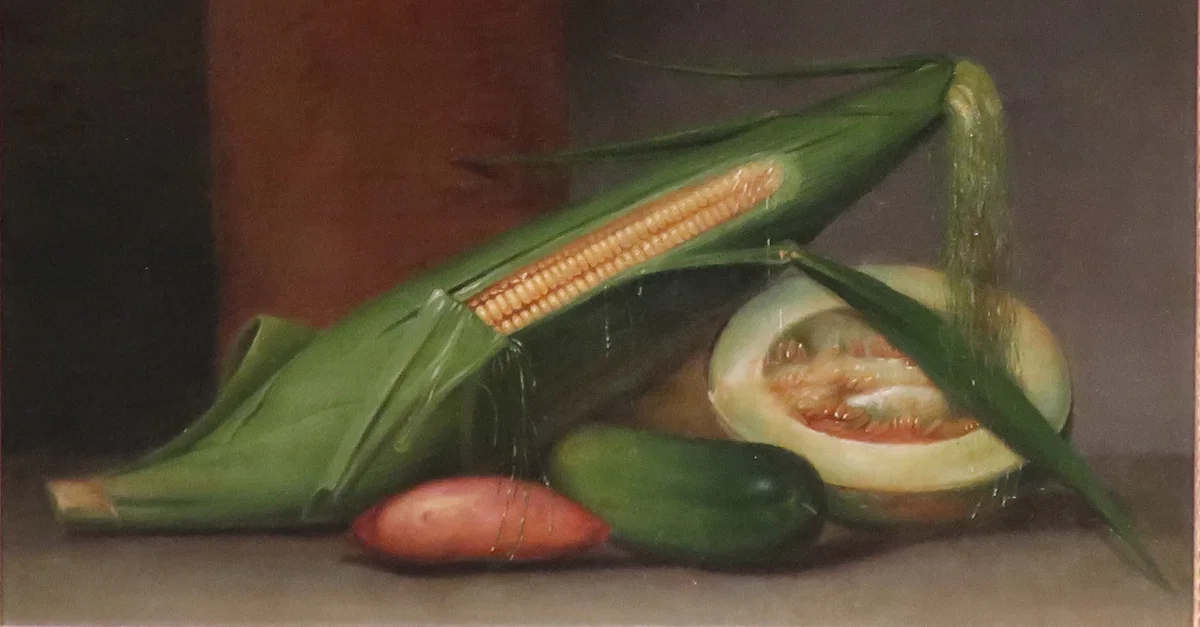 A still life painting of corn & cantaloupe, two staples of the early American diet, by American painter Raphaelle Peale (1774-1825 CE). Made c. 1813, oil on panel. Collection of the Crystal Bridges Museum of American Art in Bentonville, Arkansas, USA.