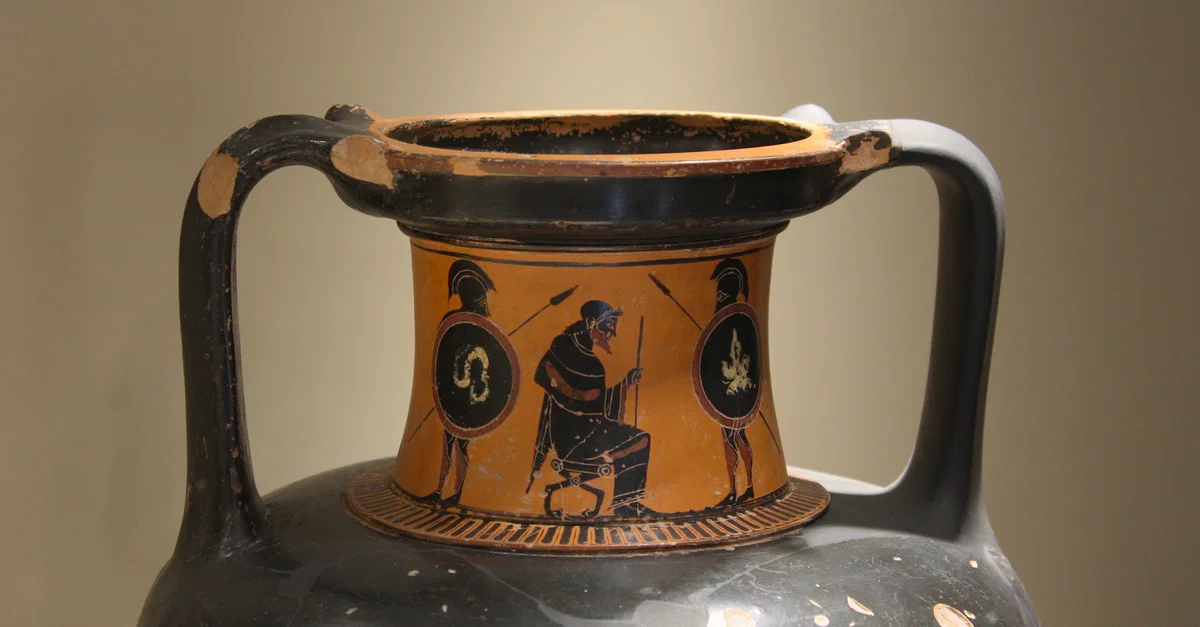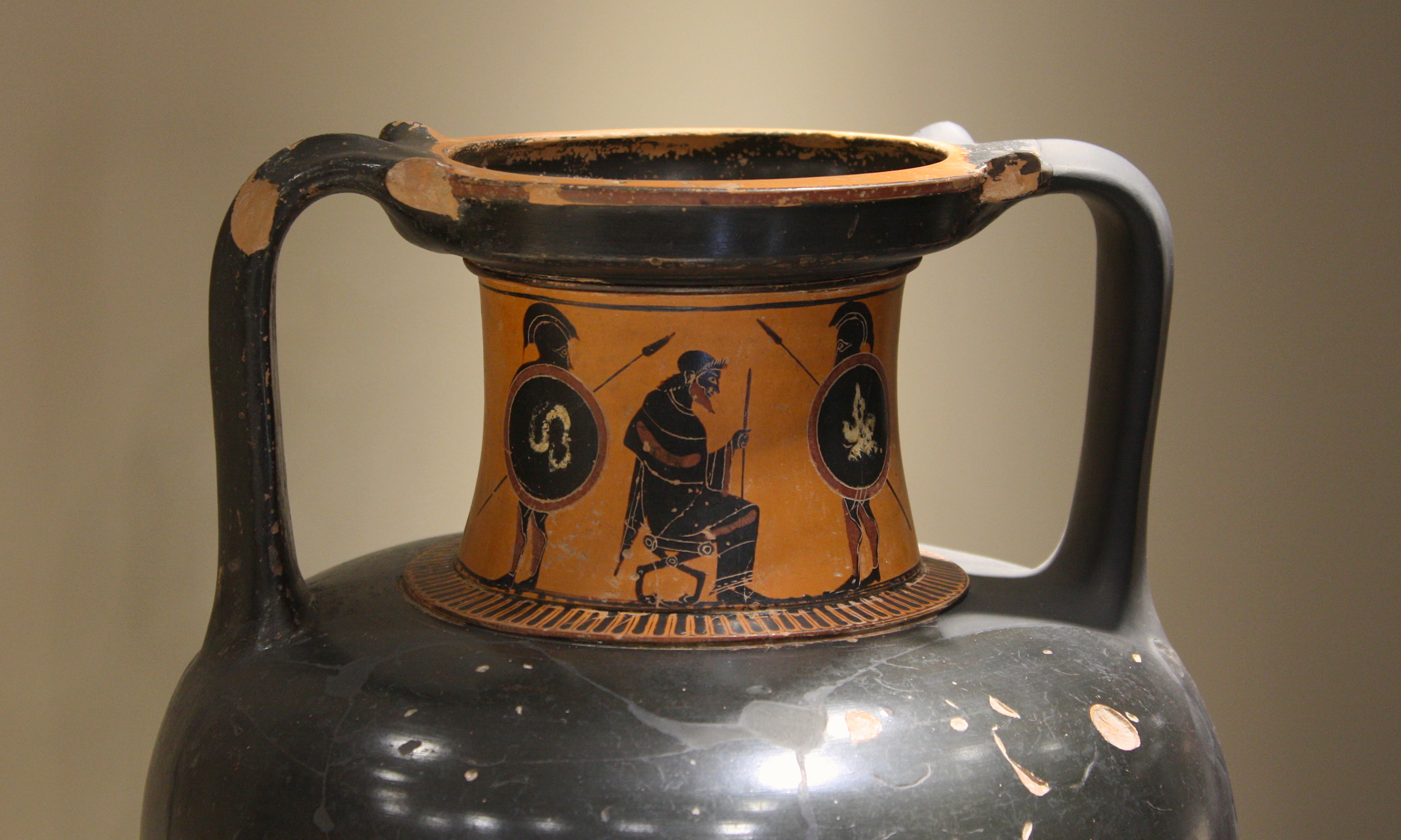 A detail of an Attic black-figure amphora showing two hoplites and an old man seated. 6th century BCE. From a tomb in Cerveteri. (Archaeological Museum, Milan, Italy)