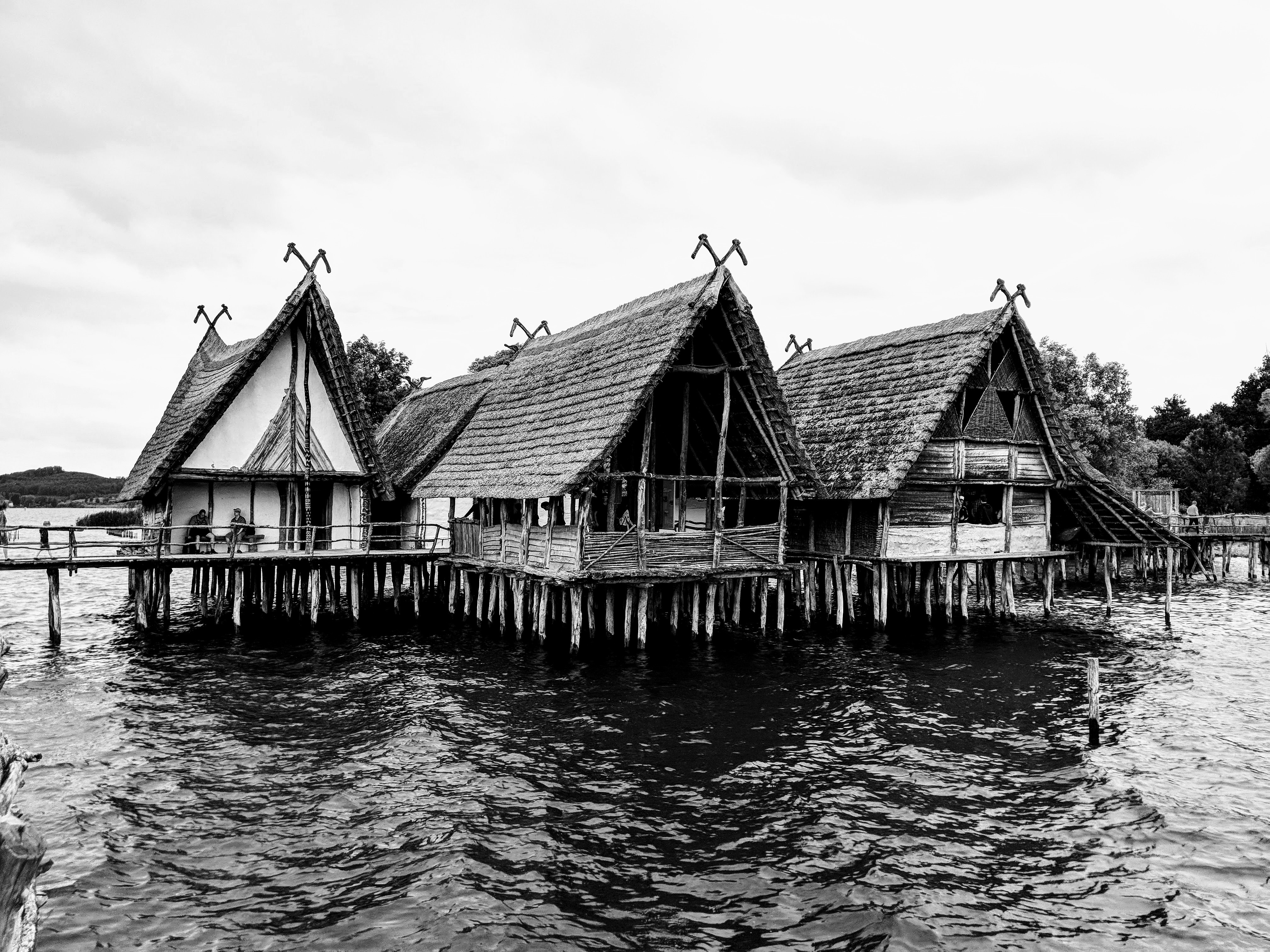Reconstructed Bronze Age stilt houses (also known as pile dwellings) at Pfahlbaumuseum Unteruhldingen, Lake Constance, Germany.