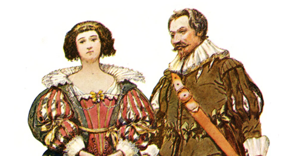 Illustration of a Dutch patroon and lady from New Amsterdam in well-made attire c. 1640 CE. From Historic Dress in America 1607 - 1800 by Elisabeth McClellan. Published in Philadelphia by George W. Jacobs and Company, 1904 CE.