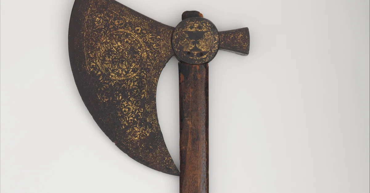 Wood-handled steel axe with gold decoration, engraved with the insignia of a Mamluk emir who held the honour of being cupbearer to the sultan. Used by a member of an axe-bearing corps, possibly similar to the Varangian Guard which protected the Byzantine Emperors. Height of 72.3 cm (28 1/2) x blade width of 23.5 cm (9 1/4 in). Weight: 1341 g (2 lb. 15 oz). Collection of the Metropolitan Museum of Art.