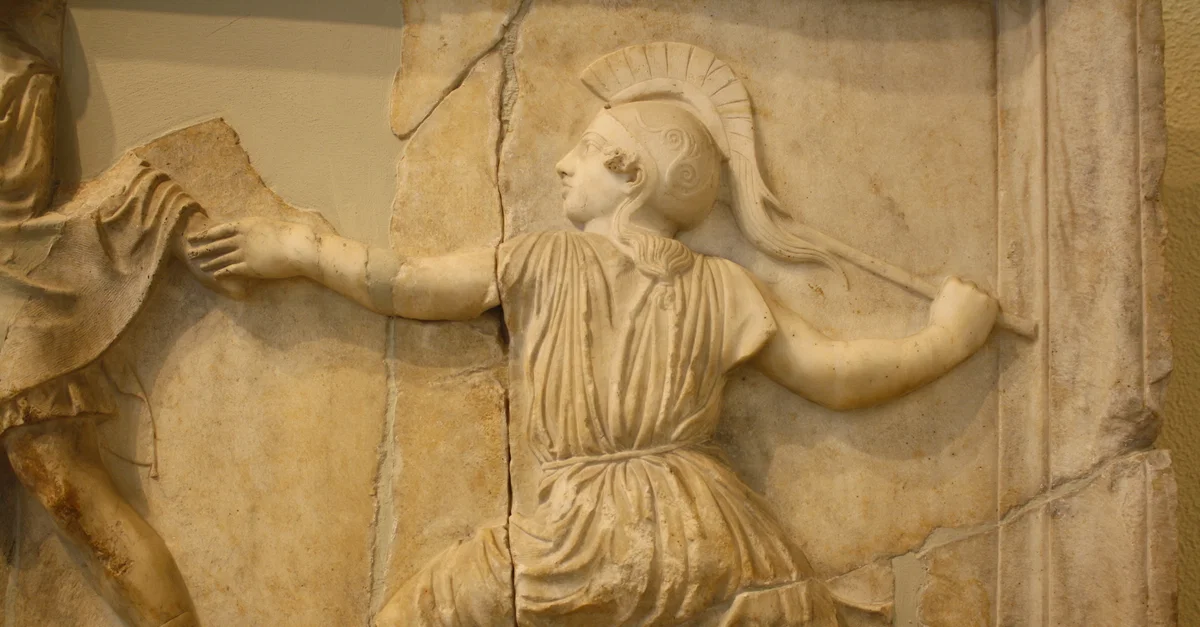 A depiction of an Amazon warrior from a 2nd century CE Attic relief slab. (Archaeological Museum of Piraeus, Athens).