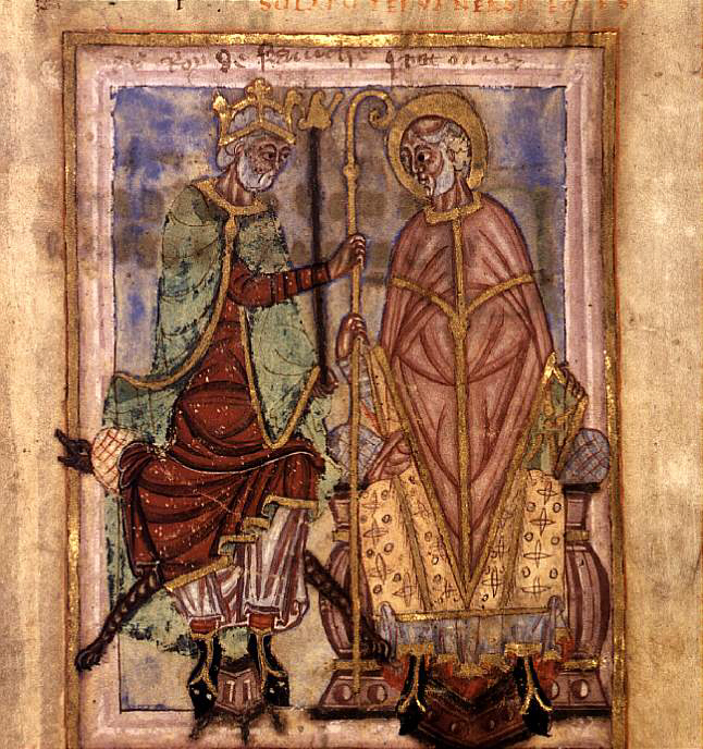 The installation and investiture of Bishop Saint Audomar of Thérouanne (early 7th century - c. 670) in 637 by Dagobert I (r. 629-639), King of the Franks. From the illuminated manuscript of the Life of Saint Omer; 11th century, Chapter of the Cathedral. Ms 698, collection of the Municipal Library of Saint-Omer.